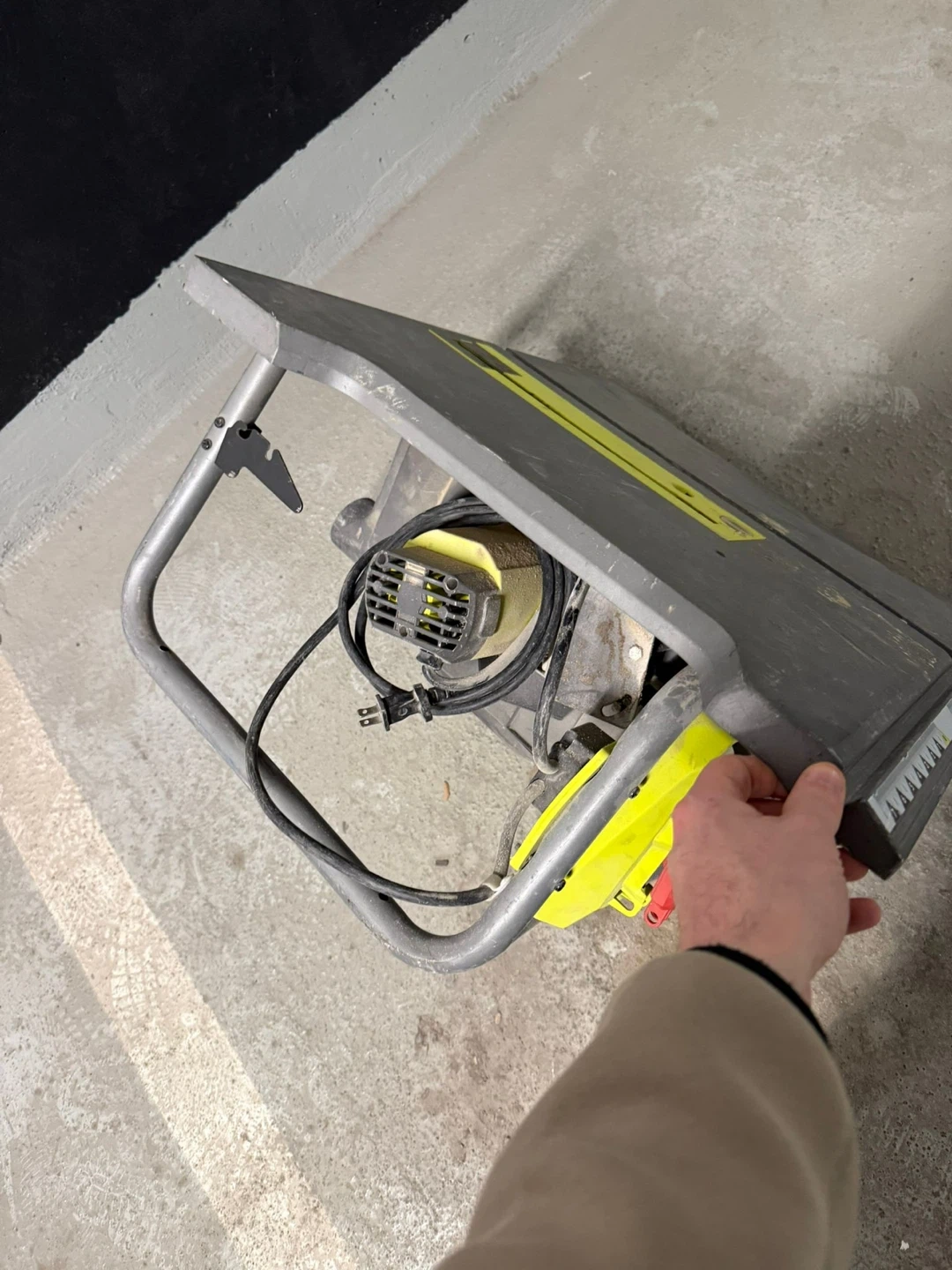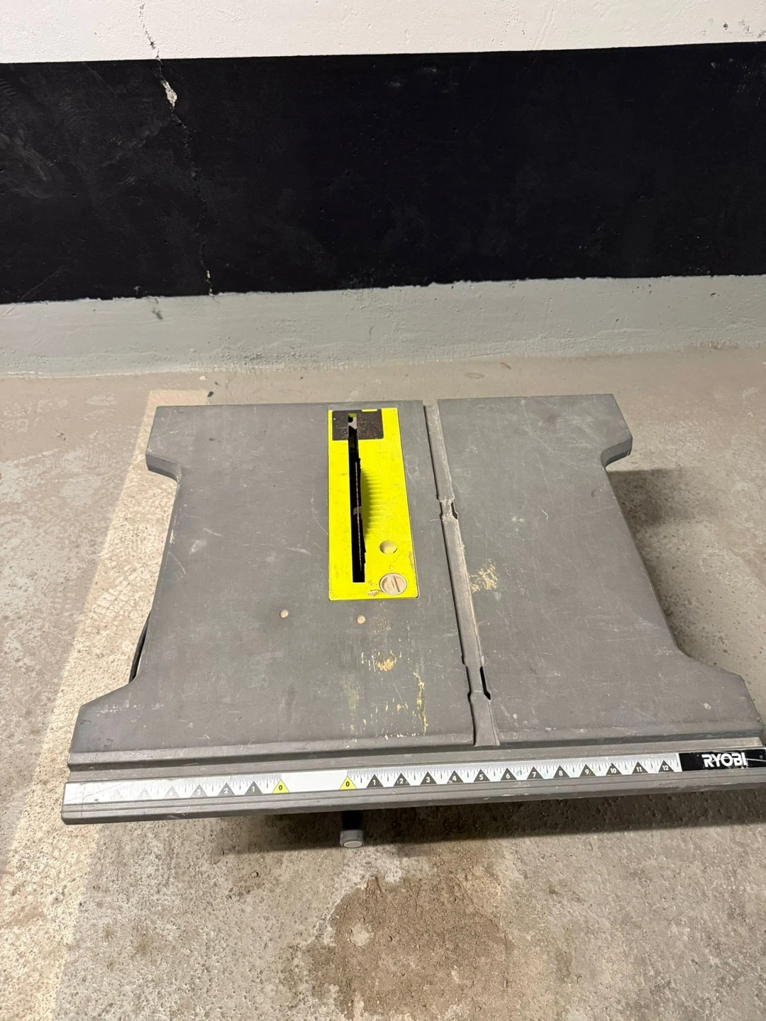 Ryobi table saw with a metal base. It's a compact unit for various cutting tasks. Blade is included. Didn’t use it much, selling it as no longer working in construction