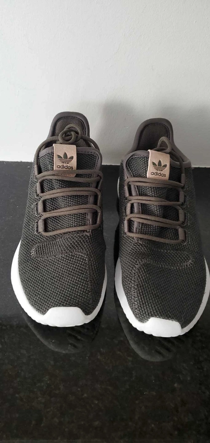 These Adidas Tubular Shadow sneakers are a stylish dark grey colour. They're made with a breathable mesh upper and a comfortable white sole. Perfect for everyday wear!