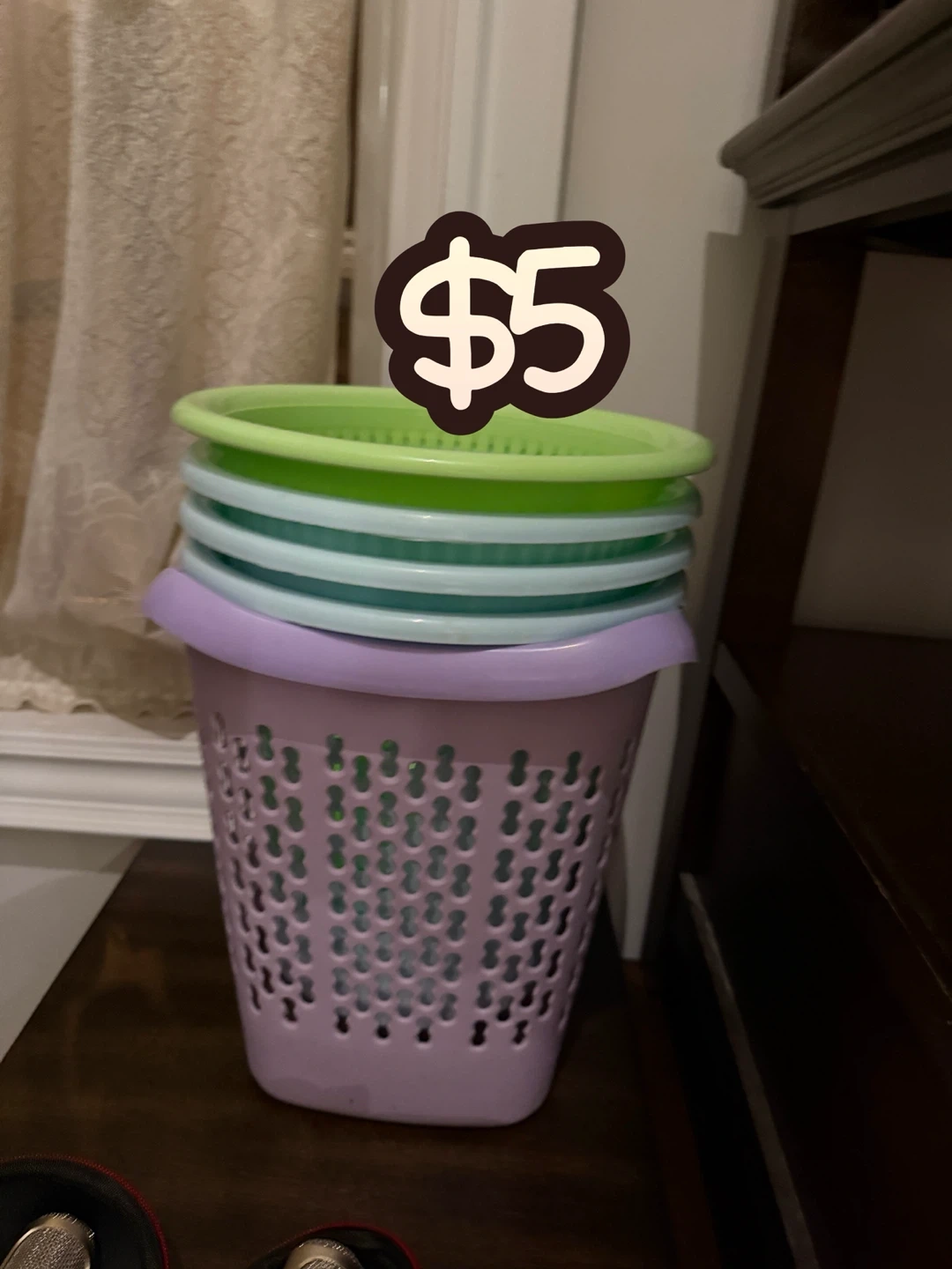 This is a stack of four plastic laundry baskets in pastel colours. Includes one purple basket and three stacking tubs in green, light blue, and pale blue. Plastic construction.