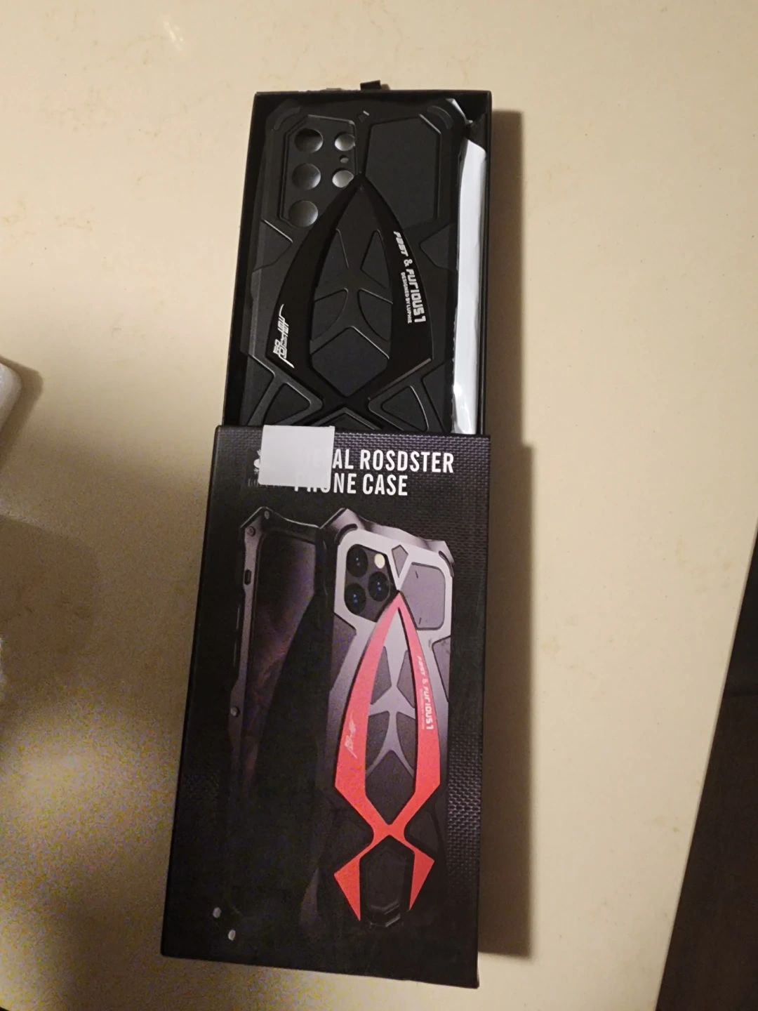 This is a FAST & FURIOUS 1 phone case designed for the Samsung Galaxy S23 Ultra. It's a rugged, black phone case with a 'roadster' inspired design. The case comes in its original packaging.