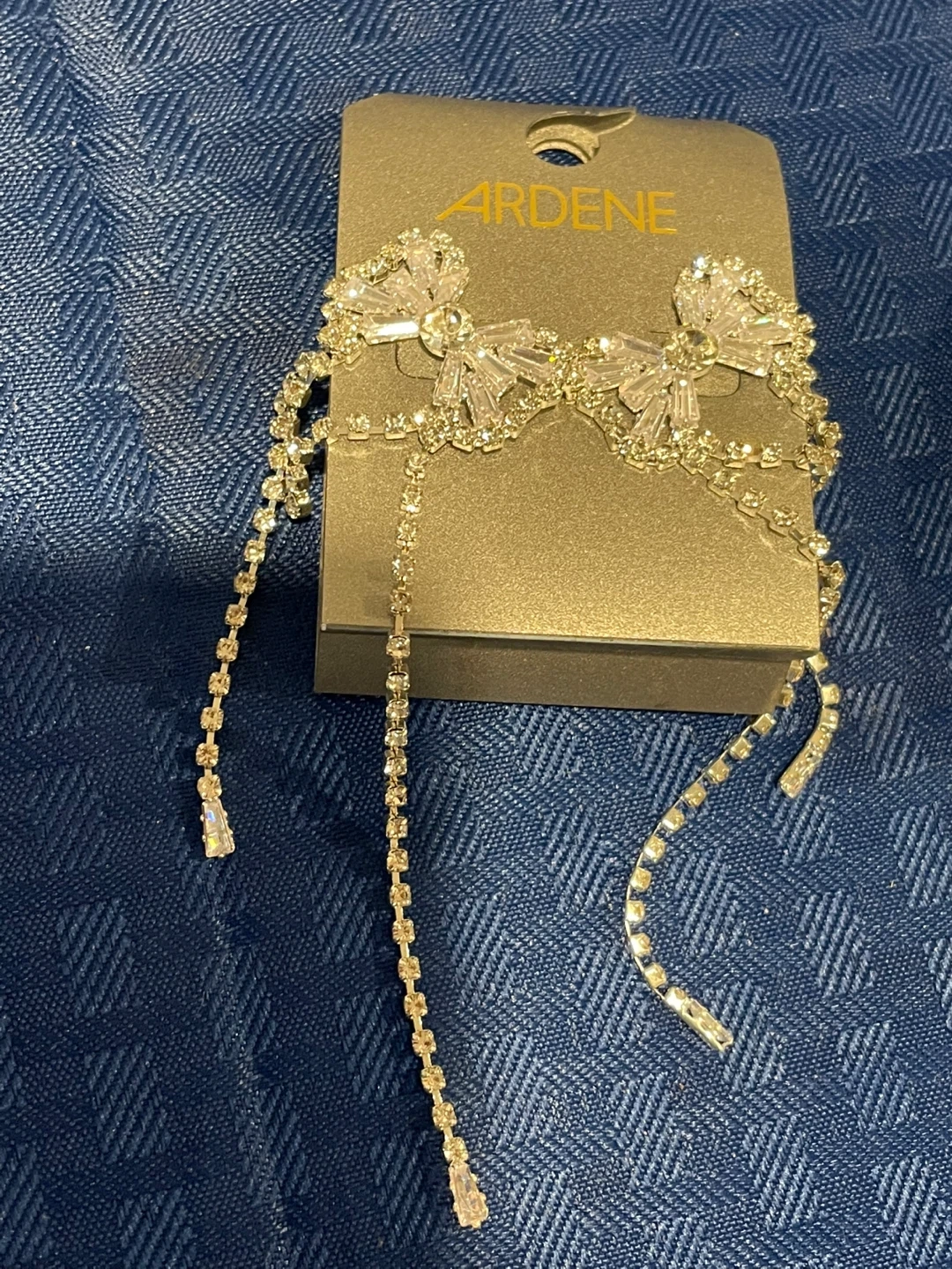Sparkly rhinestone dangle earrings with a bow detail. They're lightweight and add a touch of glam. Perfect for a night out or special occasion!