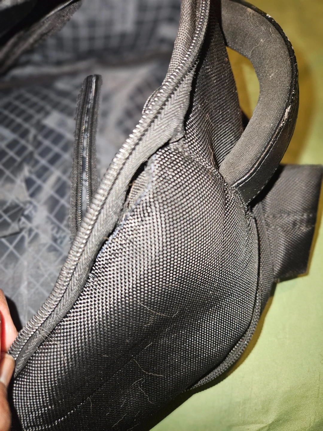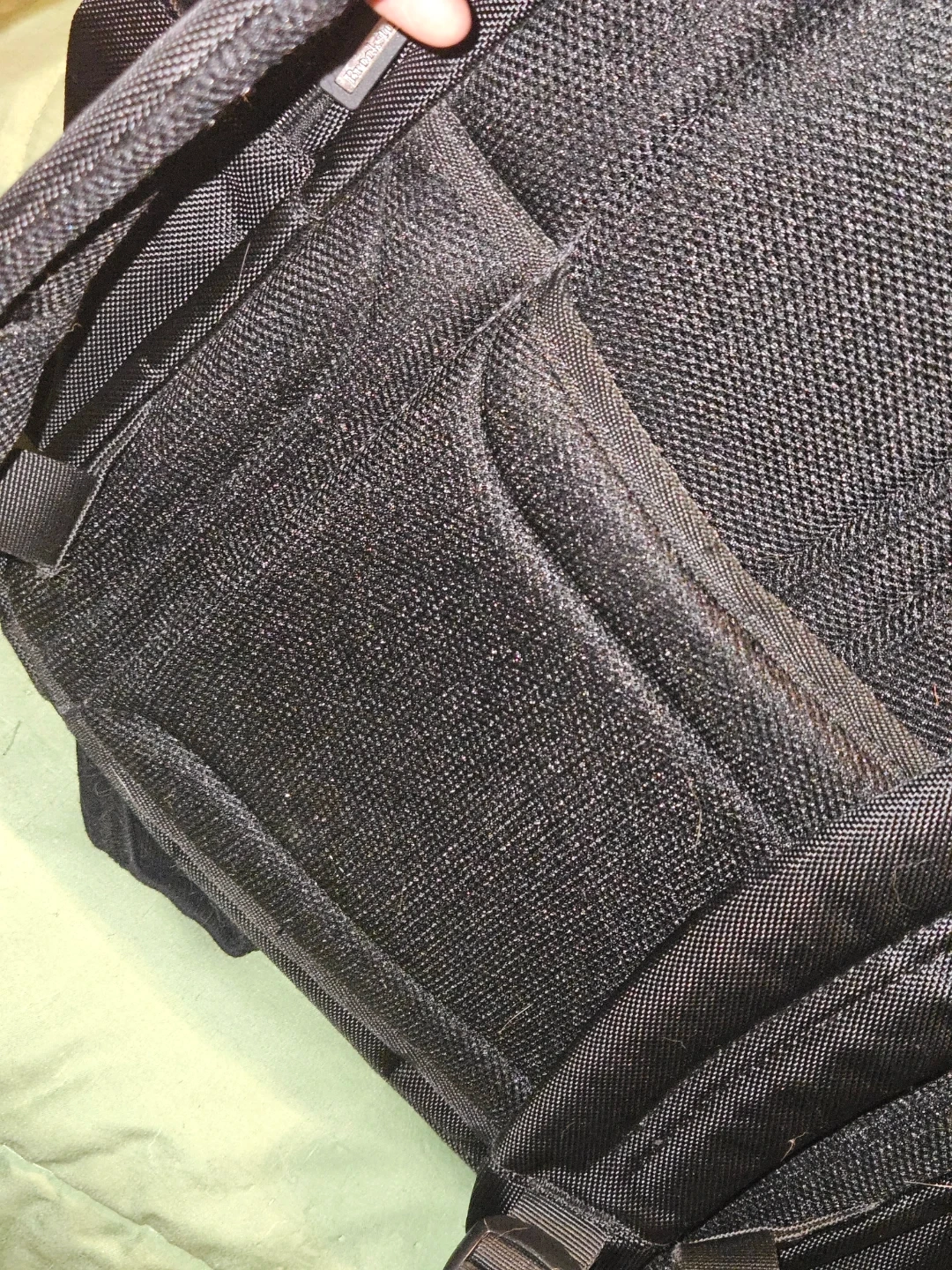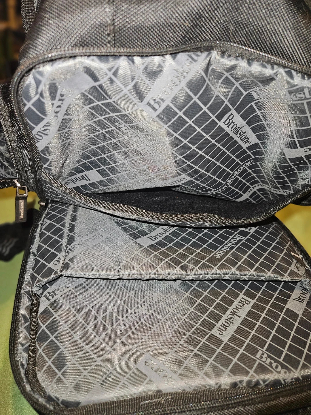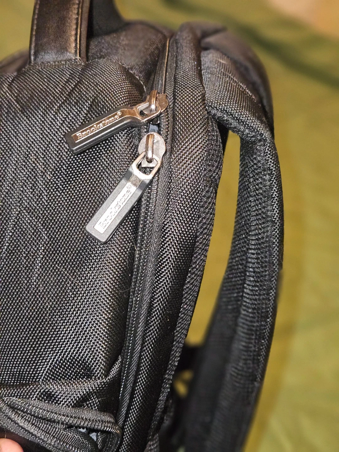 Brookstone Bryce black backpack. Made with durable woven fabric and leather accents. Multiple compartments and pockets for organization. Zippers are in good working order. Has a tear by the zipper can be hand sown or take to dry cleaner. Cost is subtracted from price listed.