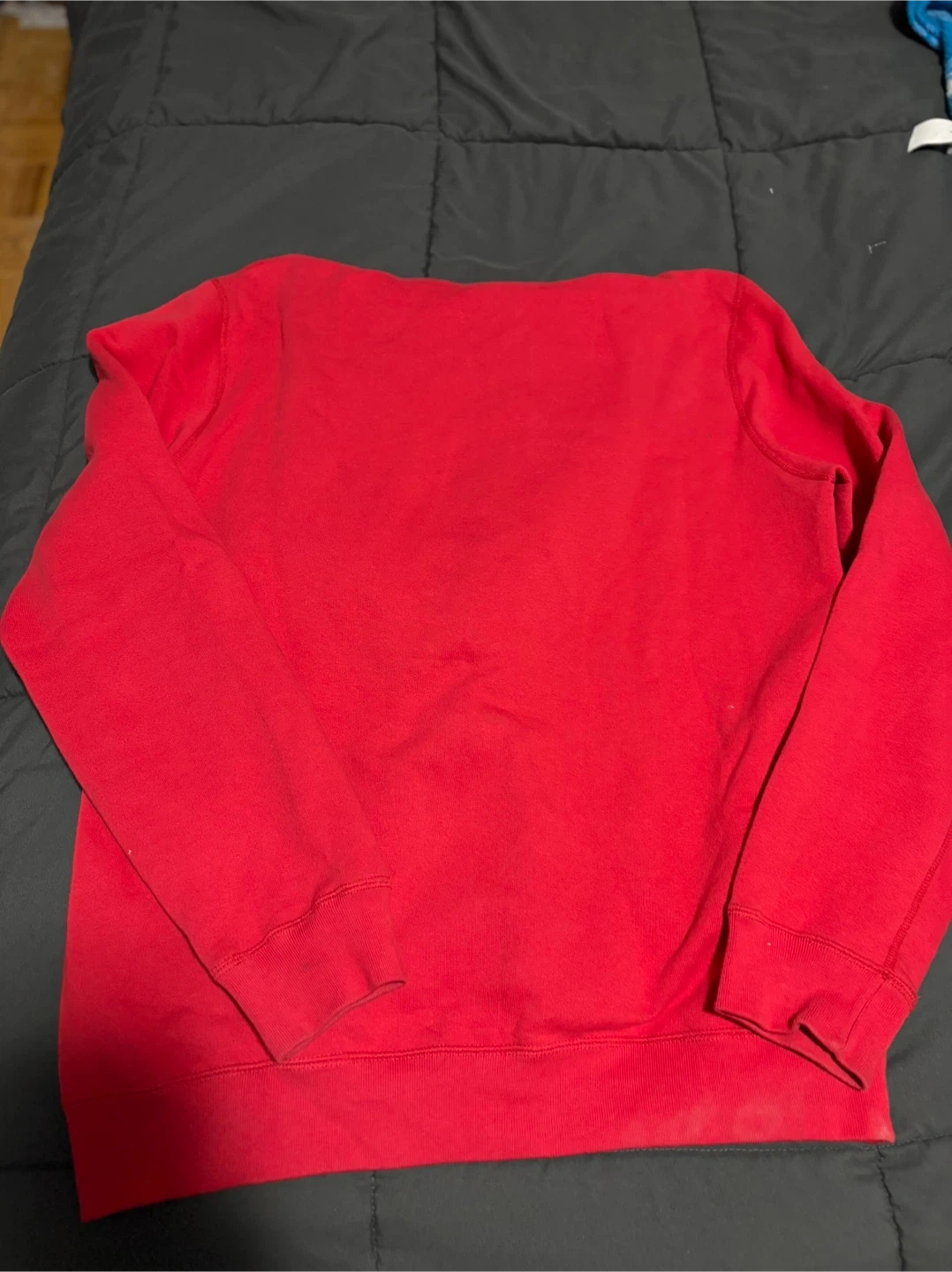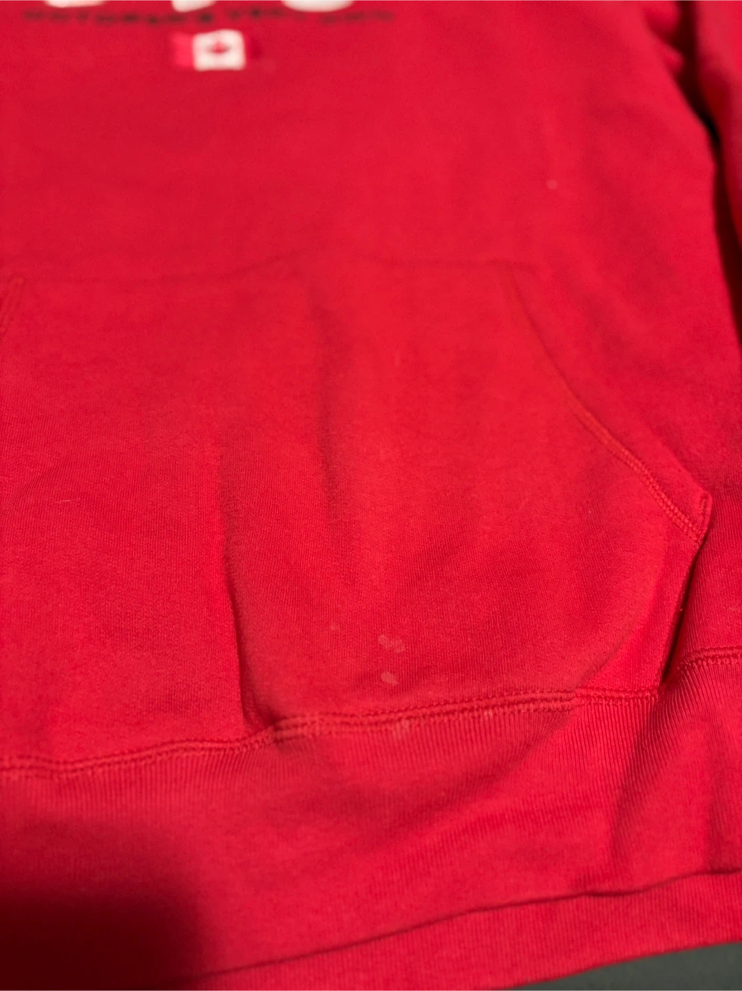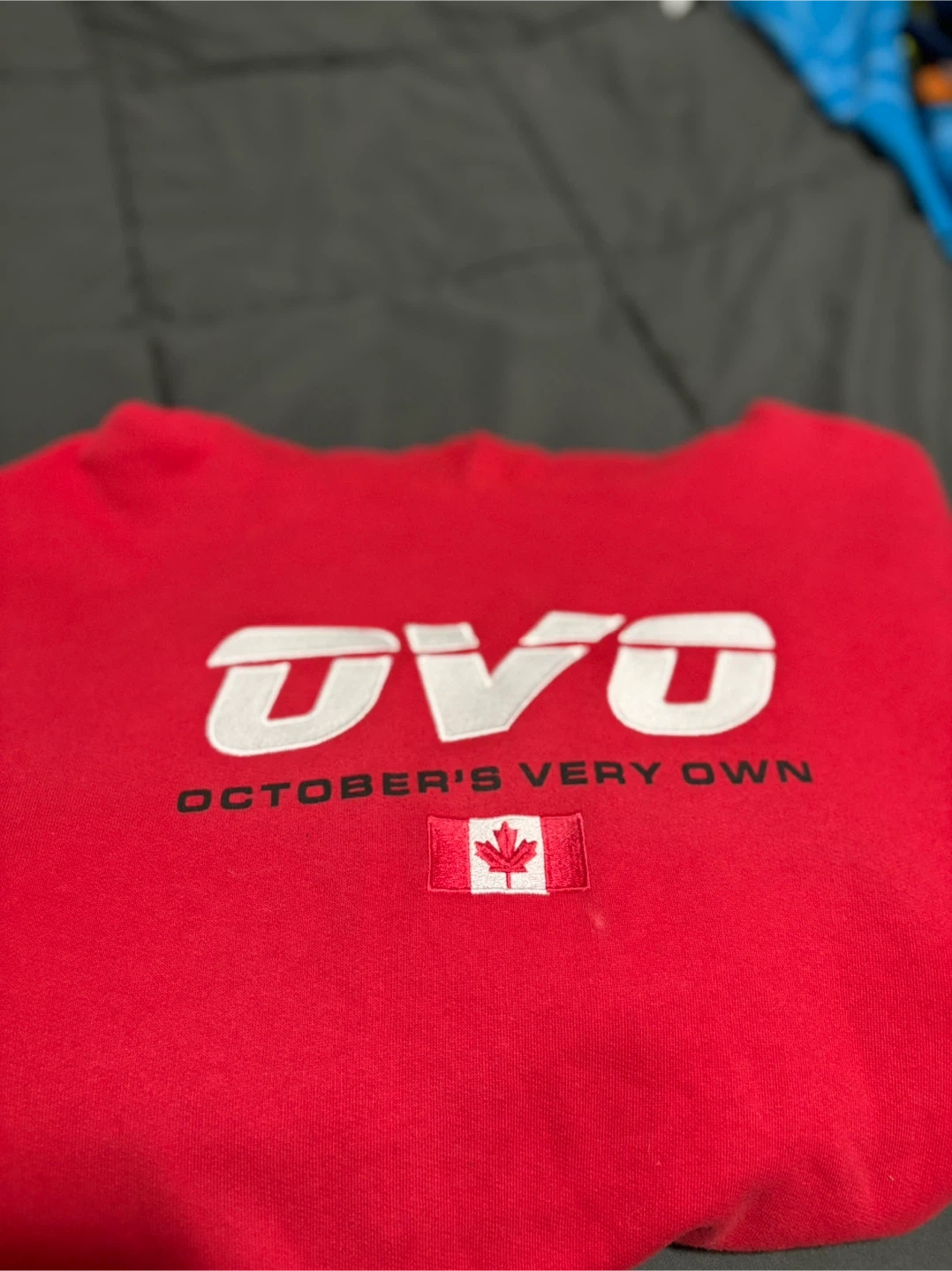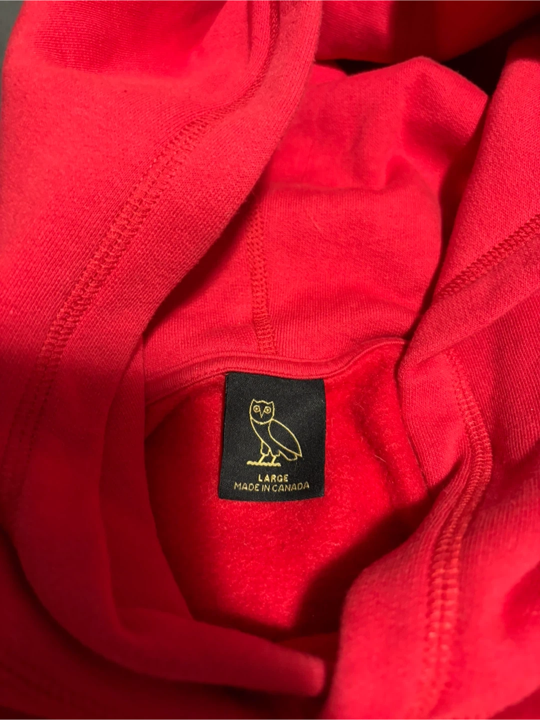 Red OVO October's Very Own hoodie. Size is large. Made in Canada. There are a few small, light marks on the front. Shown in pics and some on back
