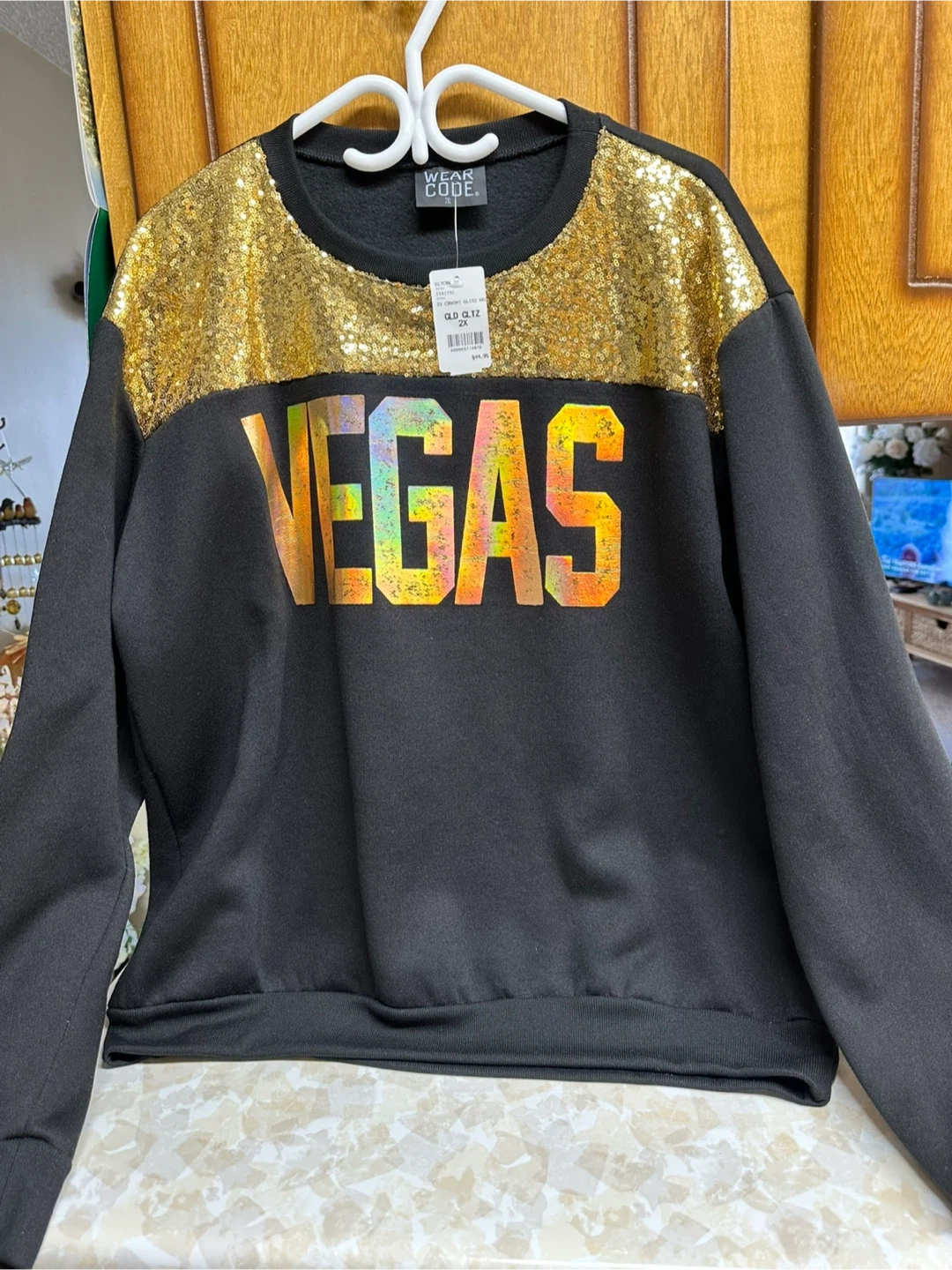 121Selling a Wear Code sweatshirt in size 2XL (fits like XL). It's black with a sequin top and the word "VEGAS" in gold glitter across the front. The tag says it's a 'GLD GLTZ' style and originally cost $44.95 U.S. Purchased in Vegas but never worn. Price is firm at $35 Pick up only McQueen Rd., Edmonton