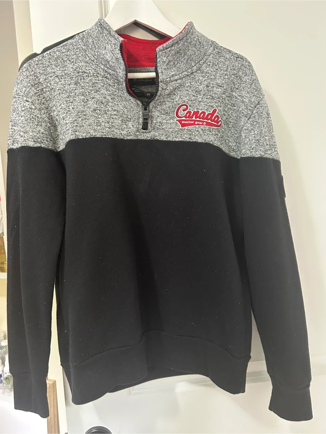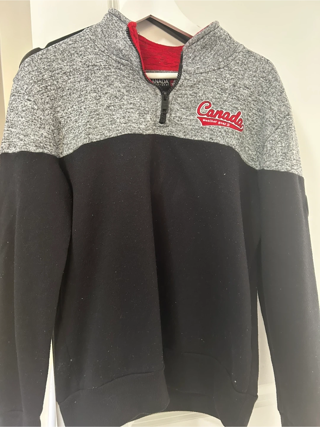 10Cozy Weather Gear Canada quarter-zip pullover in a stylish grey and black colour block design! Features the 'Canada Weather Gear' logo embroidered on the chest. Perfect for layering during those chilly Canadian days