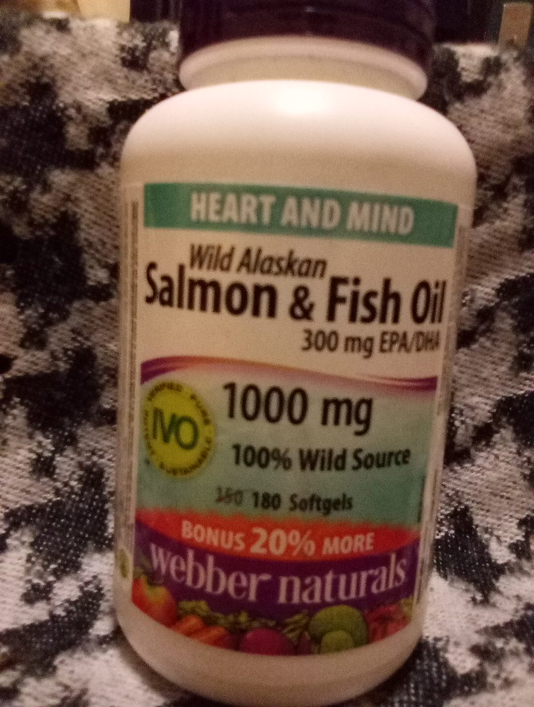 29Selling a bottle of Webber Naturals Wild Alaskan Salmon & Fish Oil softgels. This supplement supports heart and mind health. Each softgel contains 300mg of EPA/DHA and is a 100% wild source. Bonus 20% more, with 180 softgels in total