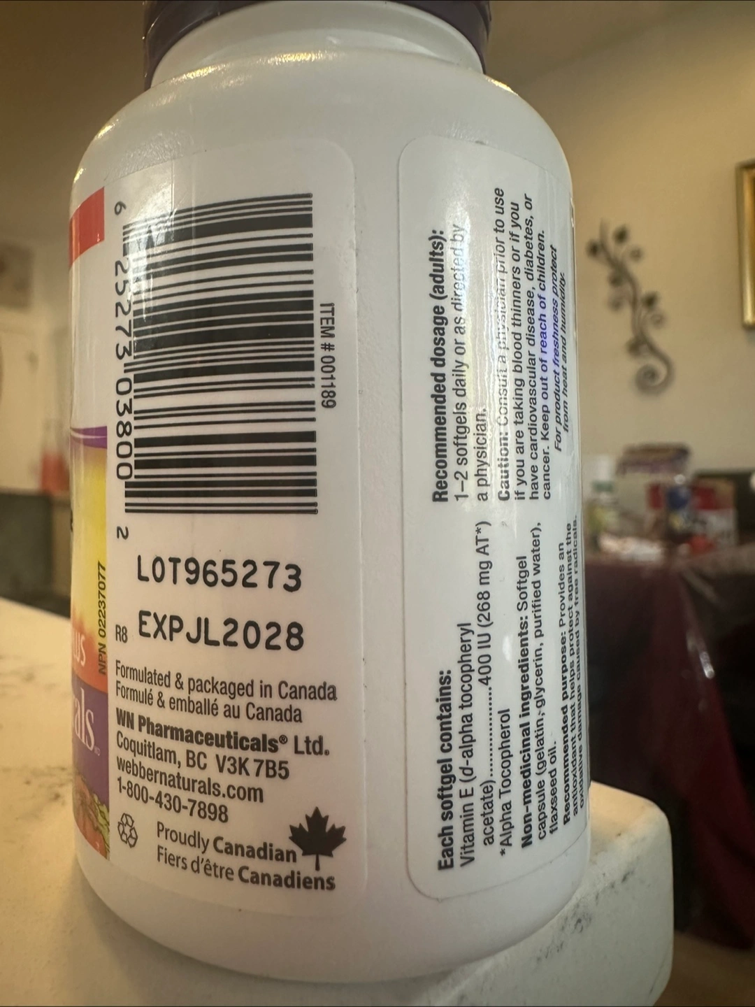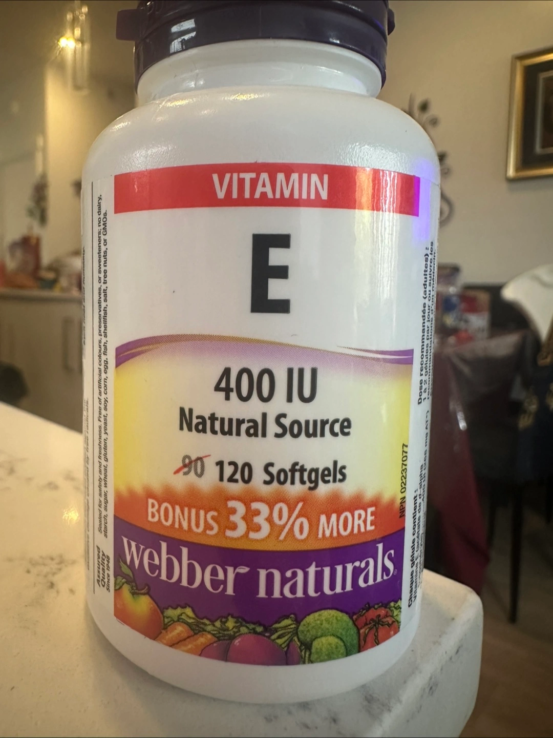 Selling a brand new bottle of Webber Naturals Vitamin E 400 IU softgels. It contains 120 softgels. Expiry date is in June 2028. Formulated and packaged in Canada.