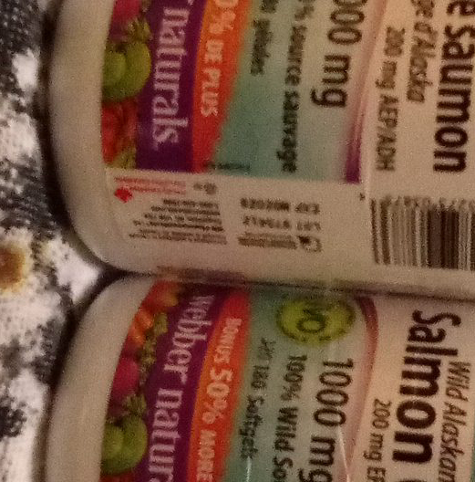 29Selling a bottle of Webber Naturals Wild Alaskan Salmon Oil. It contains 1000 mg of salmon oil with 200 mg EPA/DHA per softgel. The bottle says 'Bonus 50% More' and includes 180 softgels. Expiry Date: 2029 December