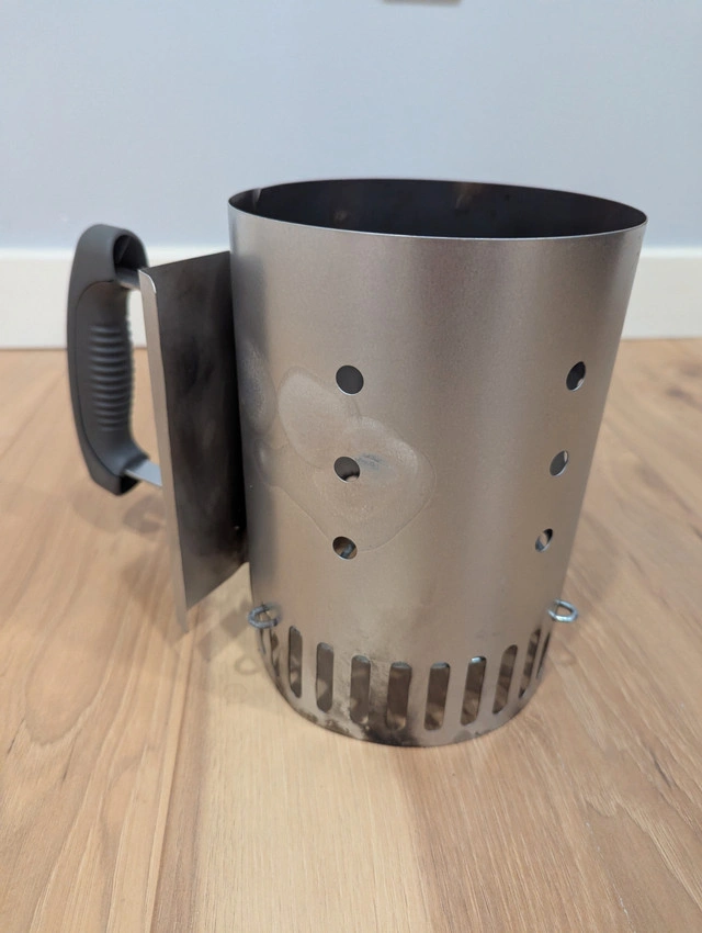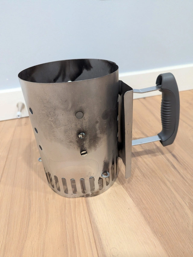 60Weber Compact Rapidfire Chimney Starter, for Charcoal briquettes (7447). Lights coals in under 15 minutes. Dimensions : 8 H x 5.8 W x 10.4 D inches. Place with coals on Weber Lighter Cubes or crumpled newspaper and light. Compact design makes it ideal for smaller grills or shorter grilling sessions. Condition: Used - Good