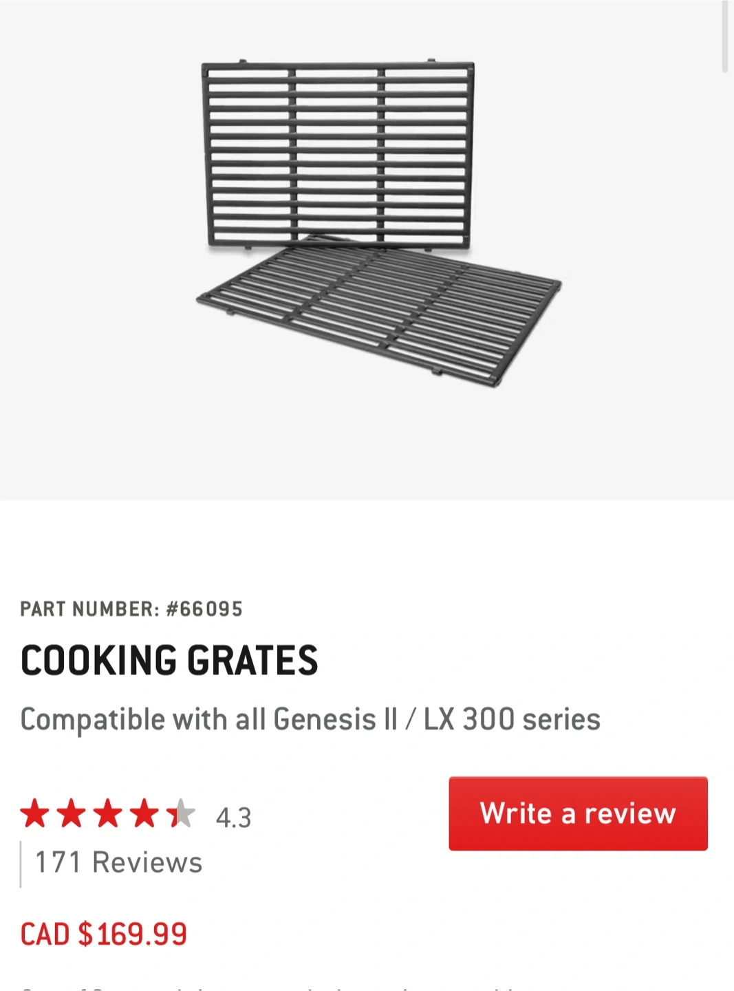 Brand New in Box Selling a set of Weber cooking grates, part number #66095. These are compatible with all Genesis II / LX 300 series grills. Retails for $169.99 CAD.