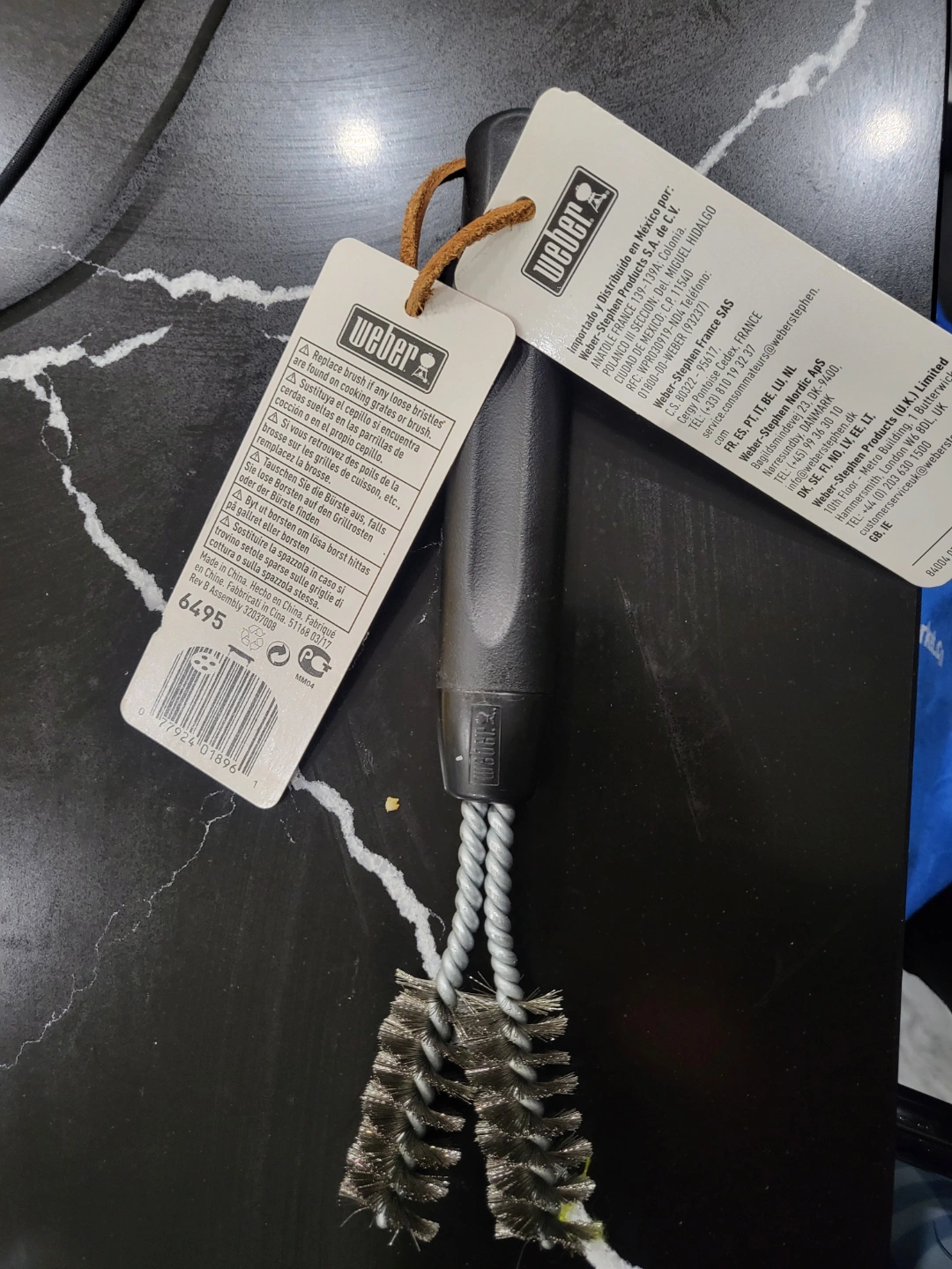 Double-sided grill cleaning brush. Features long twisted handles. Made of metal bristles and plastic. New.