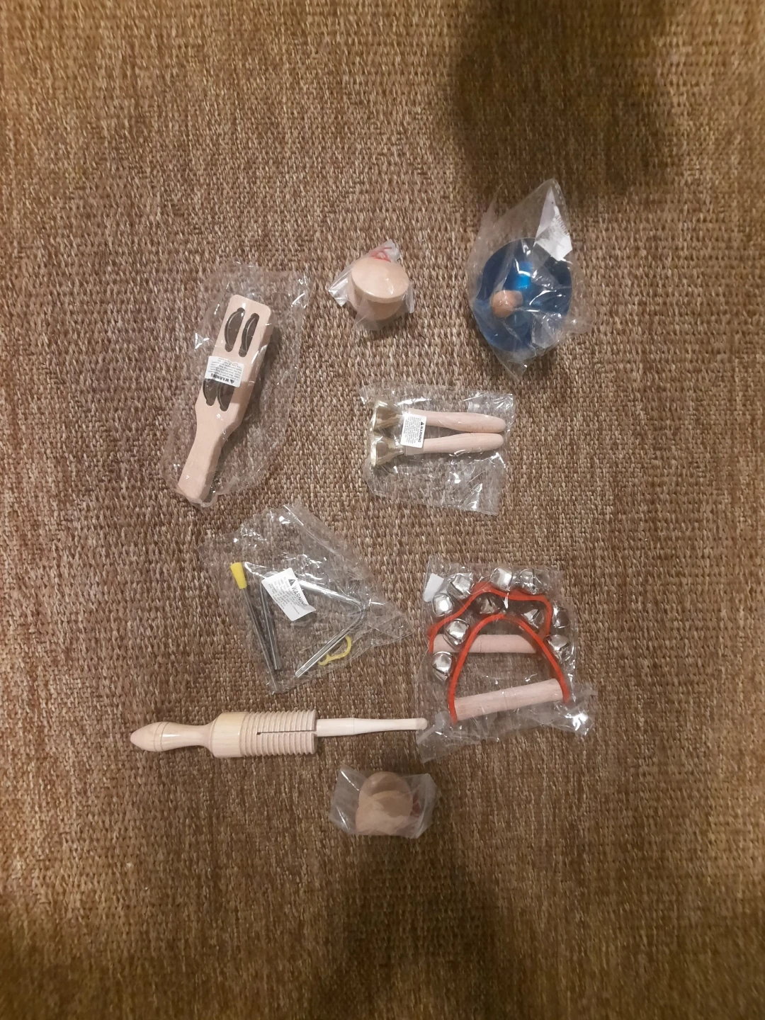 This set includes various wooden musical instruments for children. It comes with a drawstring bag for easy storage. Perfect for little ones exploring rhythm and sound!