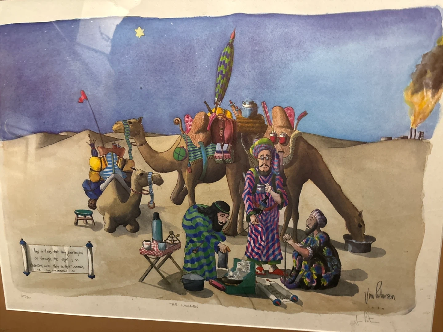 This art print depicts a whimsical scene of three colourful characters, "The Wisemen," on a long journey. It's a unique look at a familiar story with a touch of modern context. The print includes details referencing their homage to a king from another culture and religion. It's suitable for anyone interested in art or religious narratives.