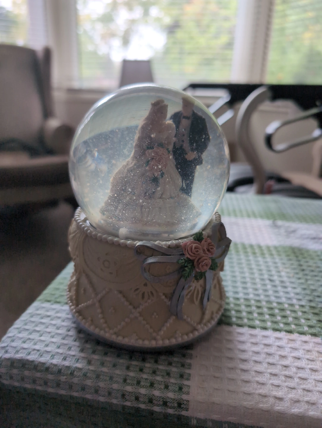 A charming snow globe featuring a wedding couple. Perfect as a decorative piece or a thoughtful gift for a newlywed couple