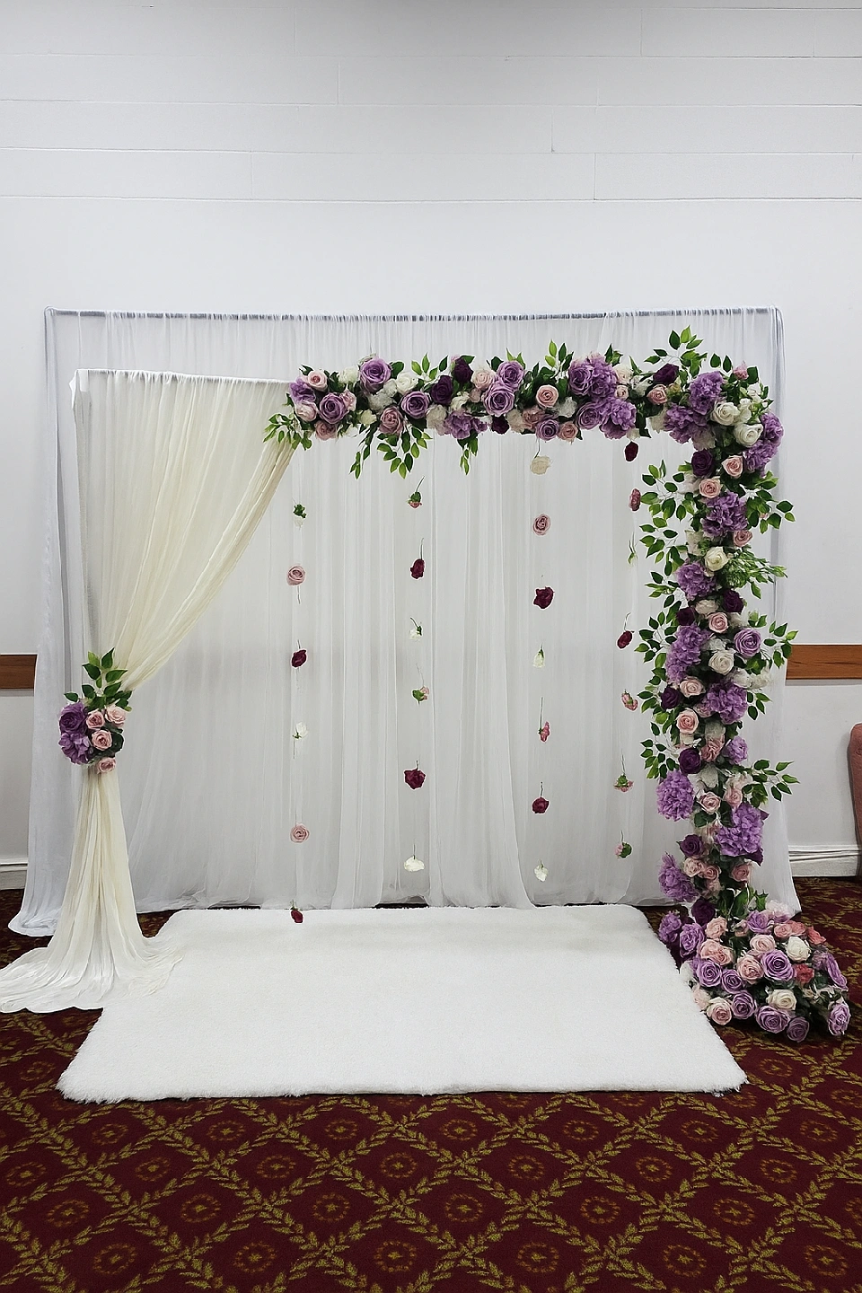 Renting a beautiful floral wedding arch, perfect for creating a stunning backdrop for your special day! The arch features a lovely arrangement of purple, pink, and white flowers, complemented by elegant white drapes. It's in great condition and ready to add a touch of romance to your wedding or event
