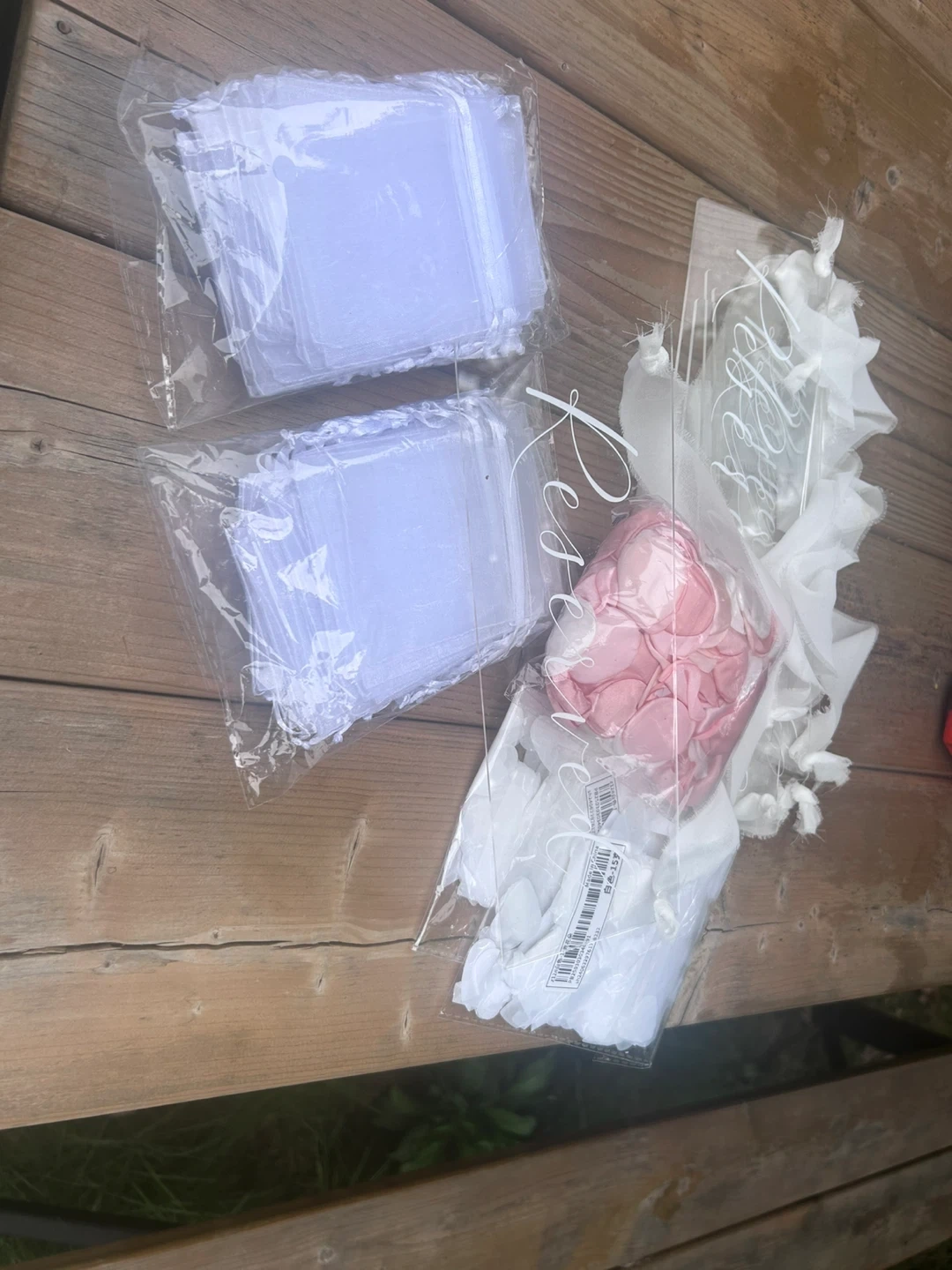 Selling some wedding decor items! 100x organza bags 2x small Paper hearts one bag Silk flower petals in blushy pink & white  6x reserved chair signs  Brand new, reserve signs were used once
