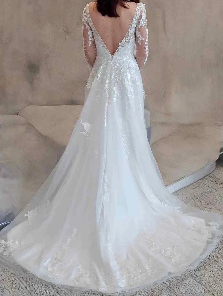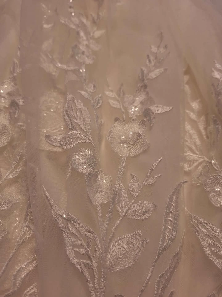 0Madi Lane-Halani Australian Designed Bridal Gown - Size 06 Fall in love with this stunning, professionally dry-cleaned, ivory bridal gown. The size 06 gown boasts a breathtaking ballgown silhouette, with layers of soft tulle and a nature-inspired embroidered appliqué. The intricate design features detailed embellishments and a beautiful, flattering V-cut neckline that is mirrored on the back of the gown.