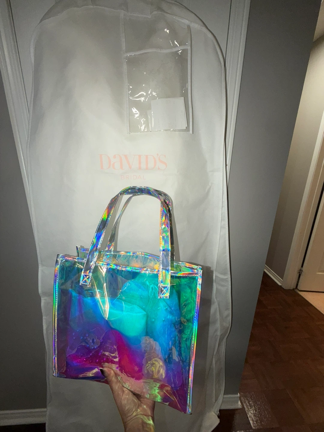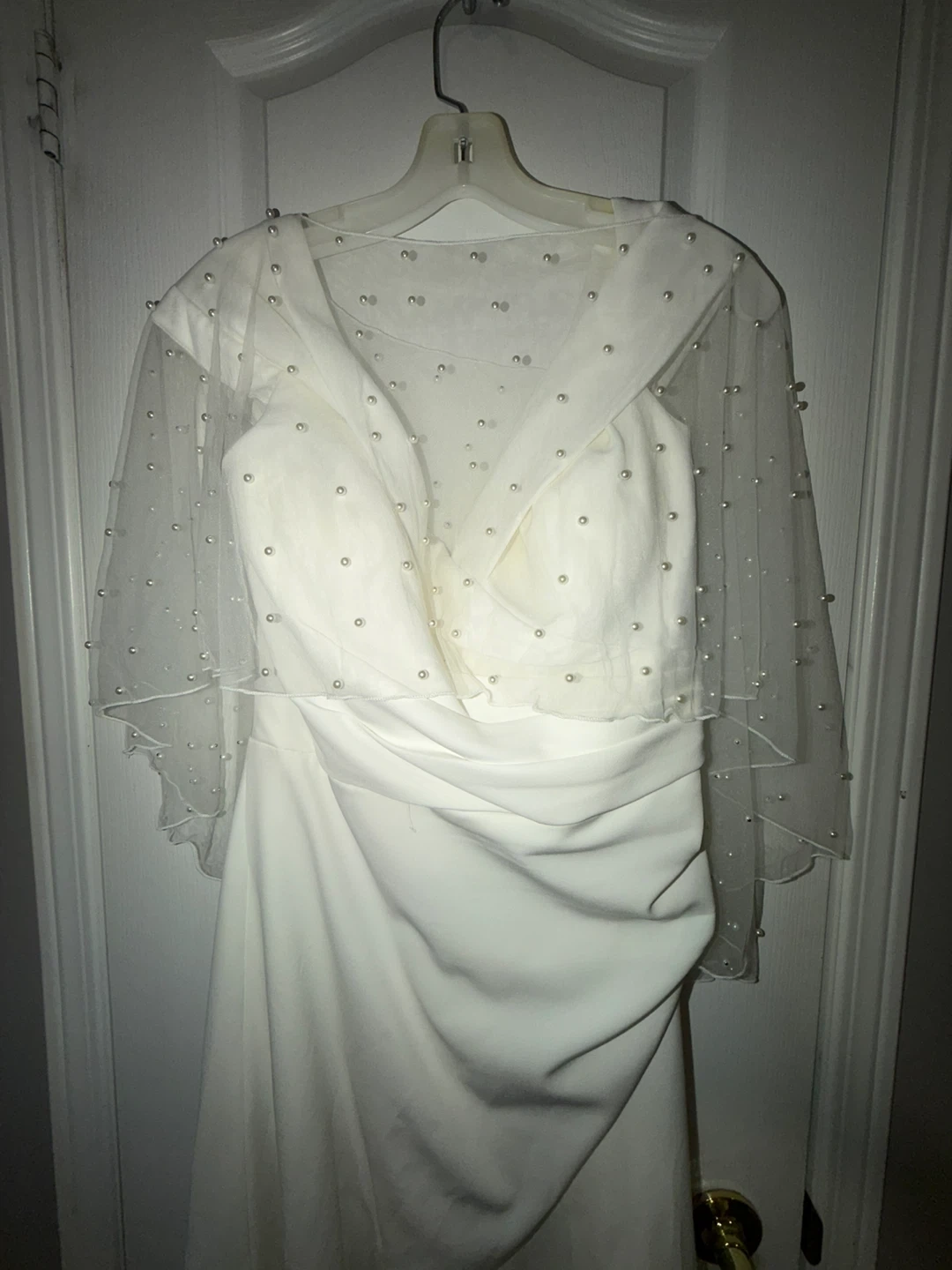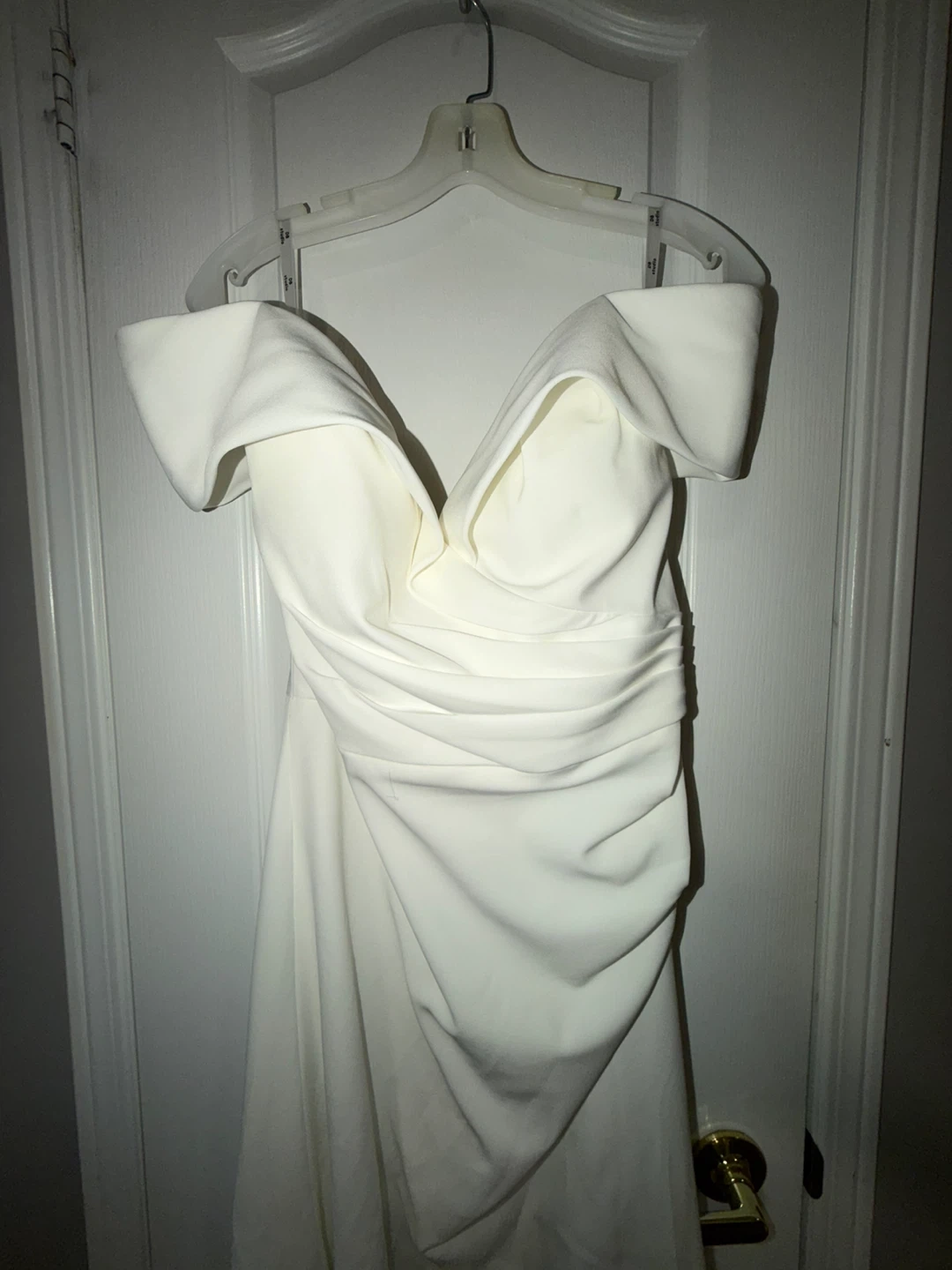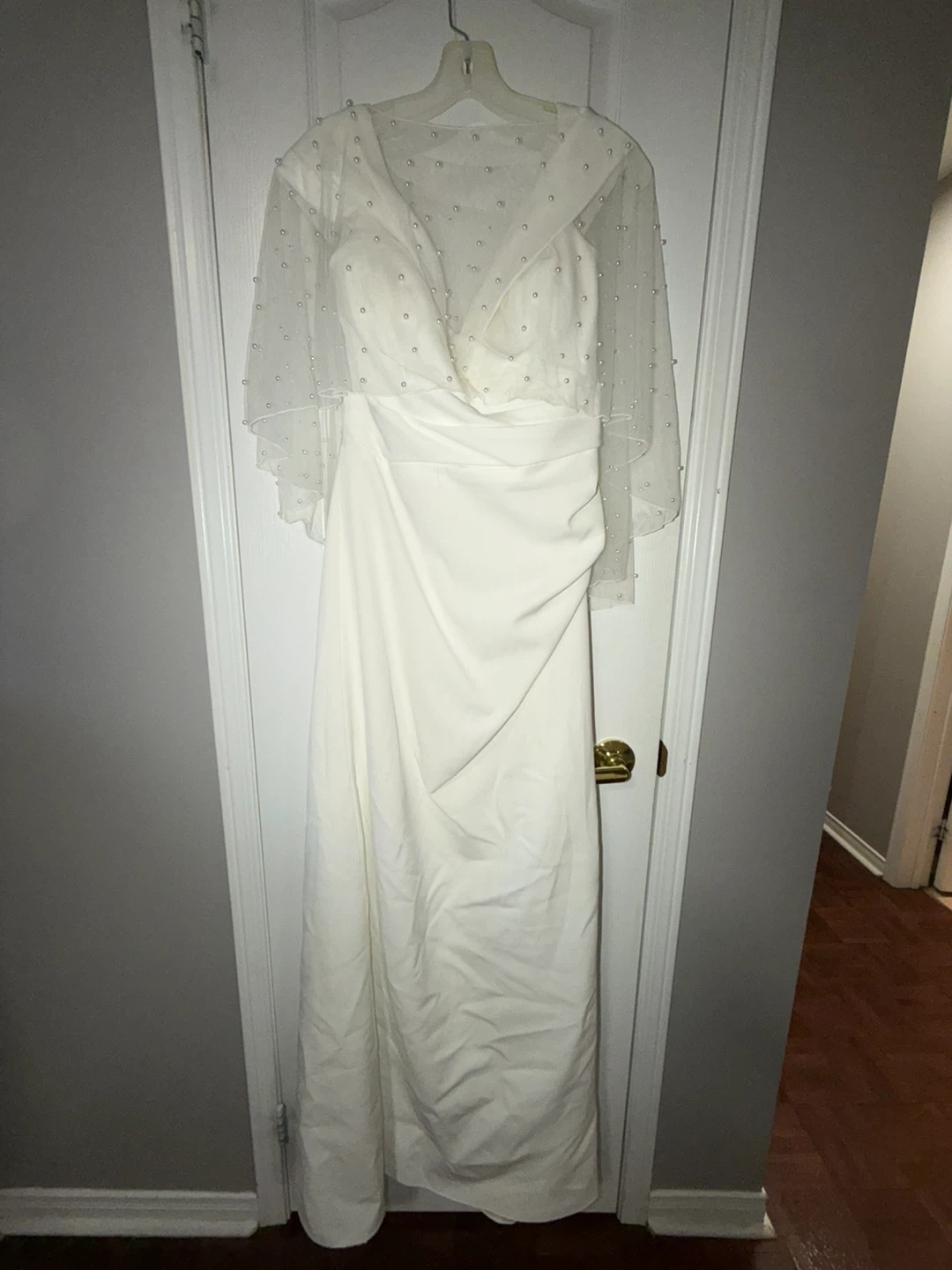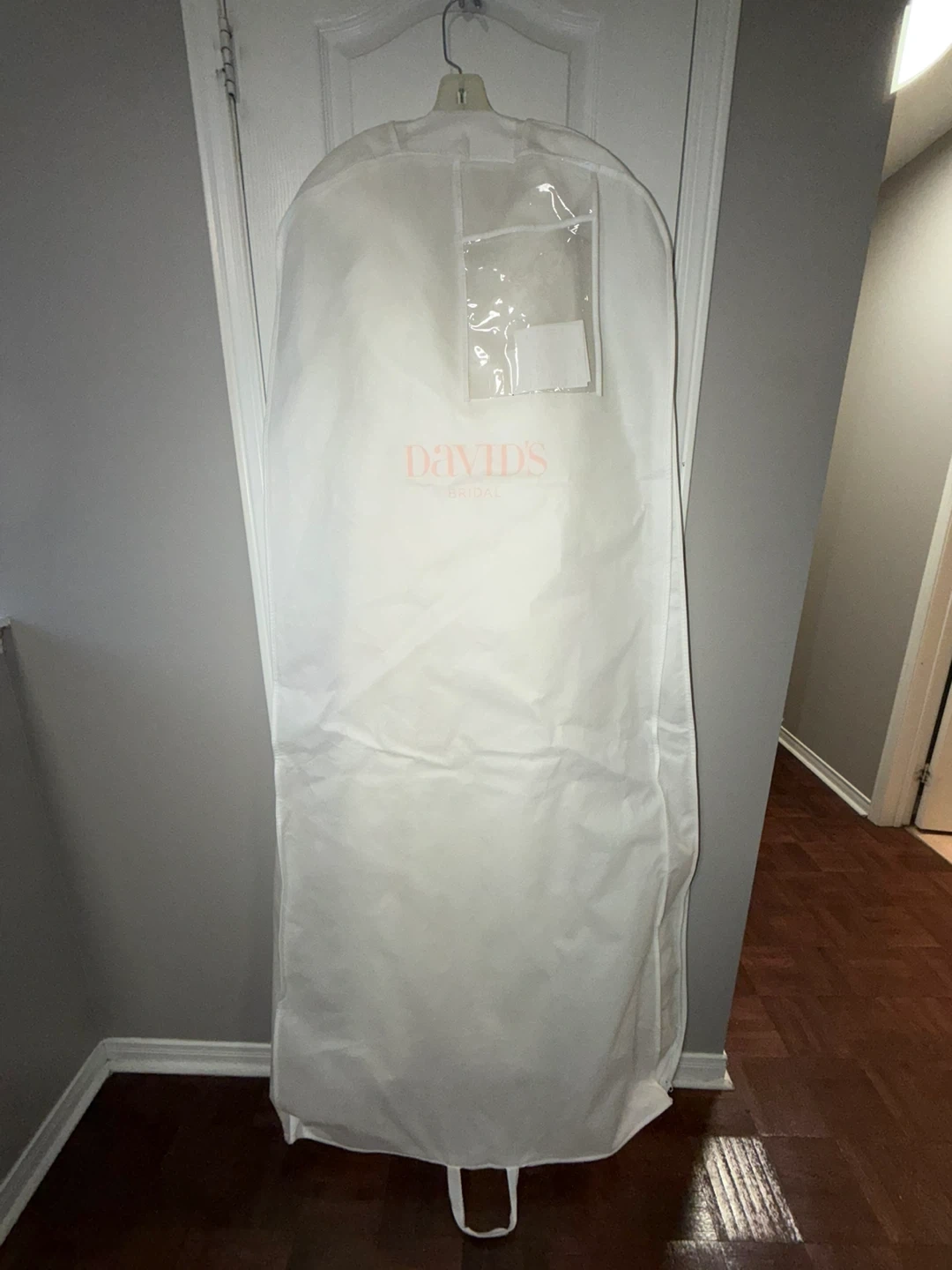 Dress is a size 12 but fits like a size 10! Purchased prior to COVID, original receipt in bag but faded. Dress needs ironing but will do great for a bride looking for something classy and timeless.