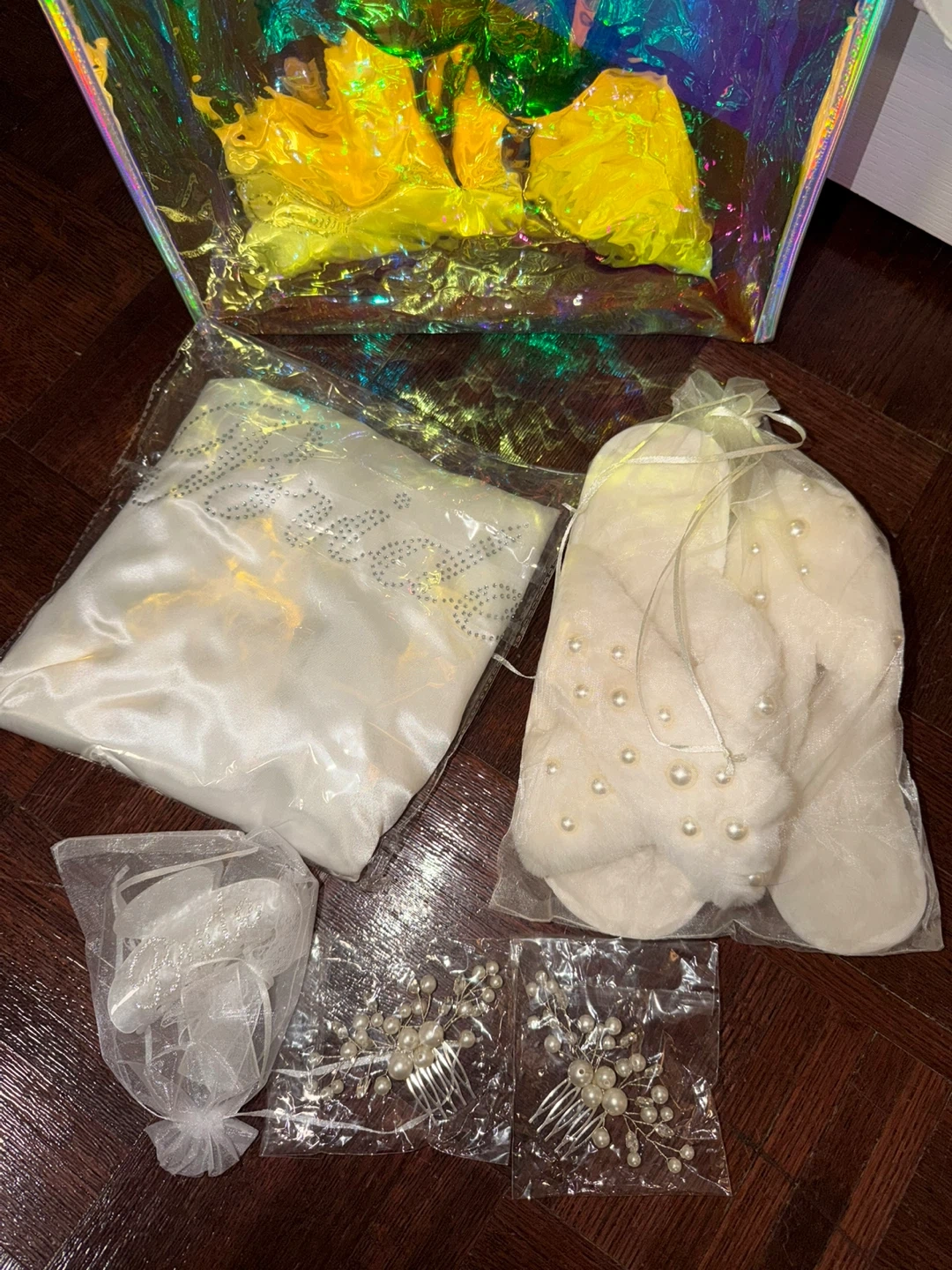 Bridal bag includes slippers, garter, hair clips, bridal robe - in excellent condition.