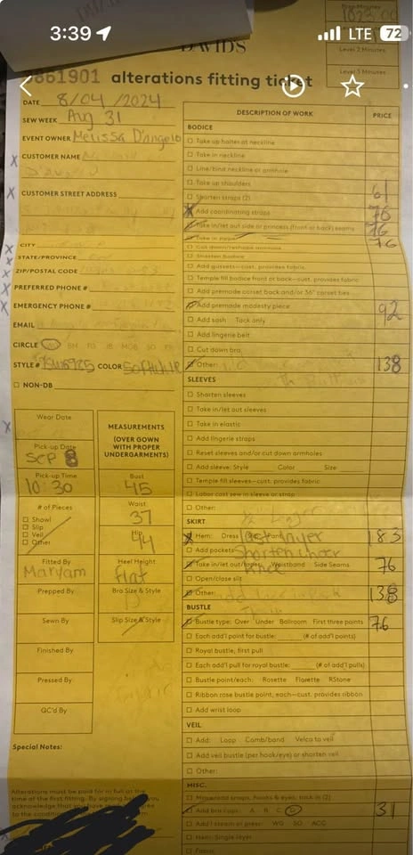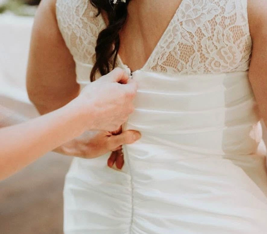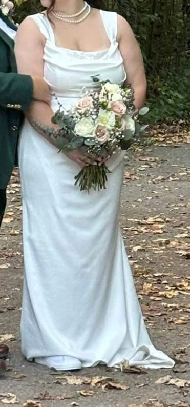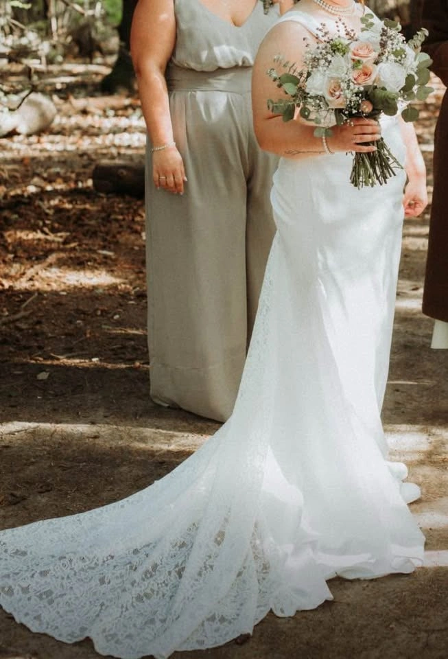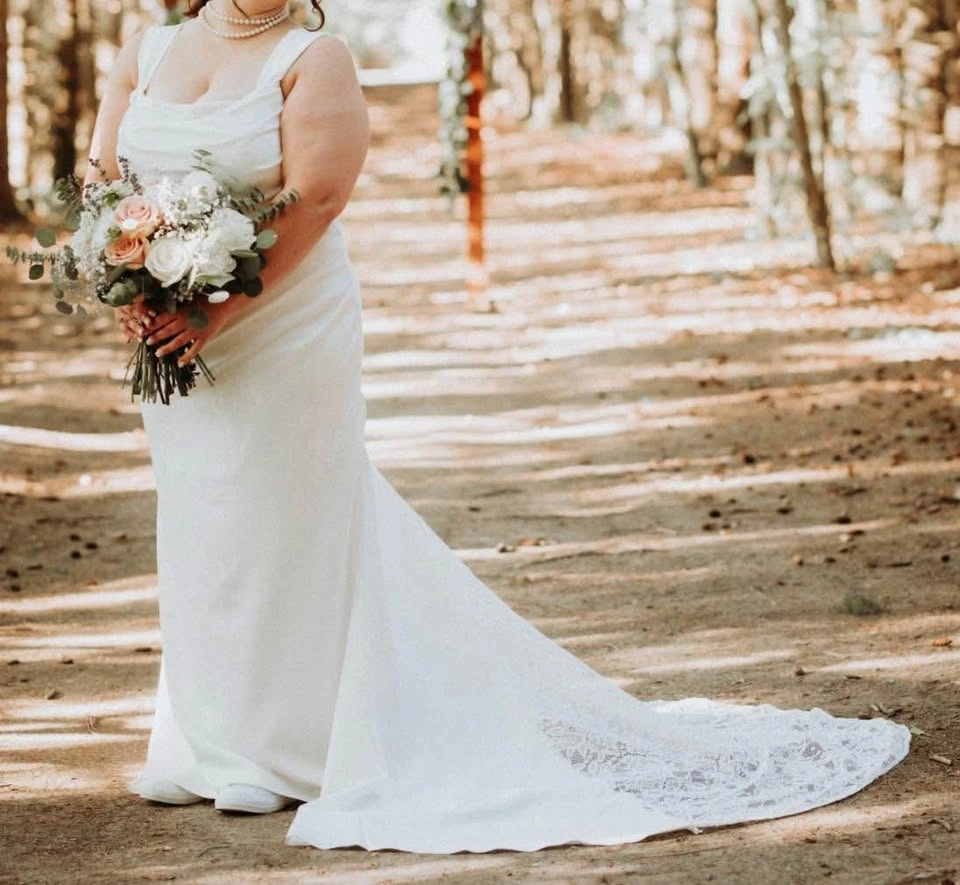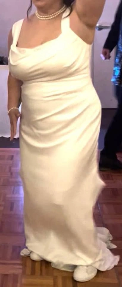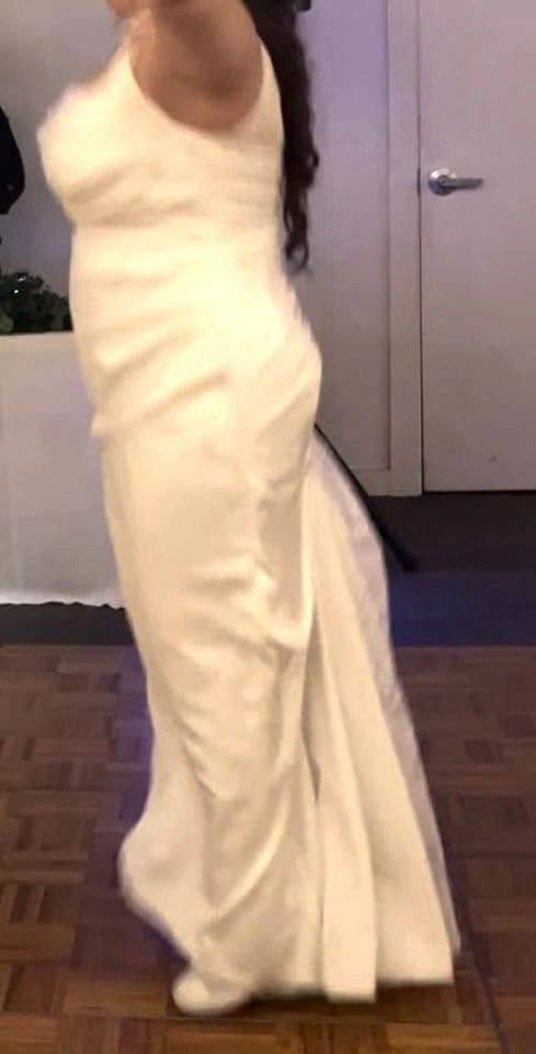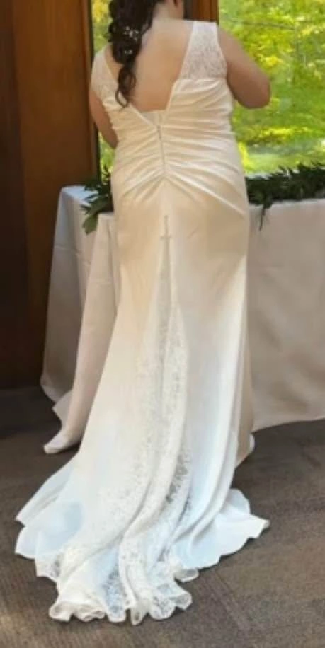 39Satin dress with custom lace on the chest, back, and in the train. Professionally cleaned and back in the bag - used in our fall wedding :) Roughly wedding dress size 16 ish. Purchased and altered at David's Bridal. Alterations posted in the final photo. Pick up only keele and 401, toronto, alternatively, along 401 between mississauga and milton or oakville during weekdays from 2:45-3:30pm (after i finish work)