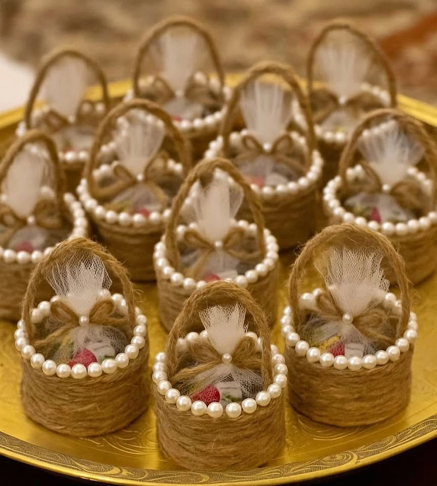 0Wedding favor baskets Nikkah Bidh Initials can be added for an additional cost. Each basket can be filled with wrapped treats, nuts, or chocolates. Clients may provide their own fillings. Pricing will vary depending on the chosen filling.