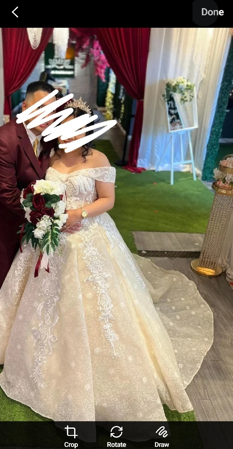 70Selling a beautiful wedding dress. It features delicate lace detailing and an off-the-shoulder design. Perfect for your special day!