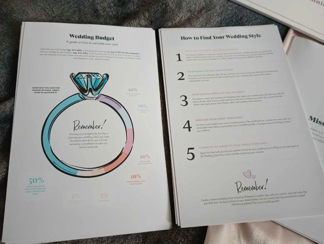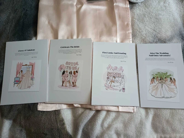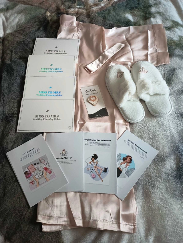 Wedding Planning Items: - 8 sets of cards with lots of tips for wedding planning (from 9 orders of Miss to Mrs. boxes). -rose gold silk robe - new, never worn, size small - slippers - new, never worn, size 6-8 - phone grip and stand - diamond ring shape (new in package) Smoke free home. Pick up near Banwell and the Expressway.