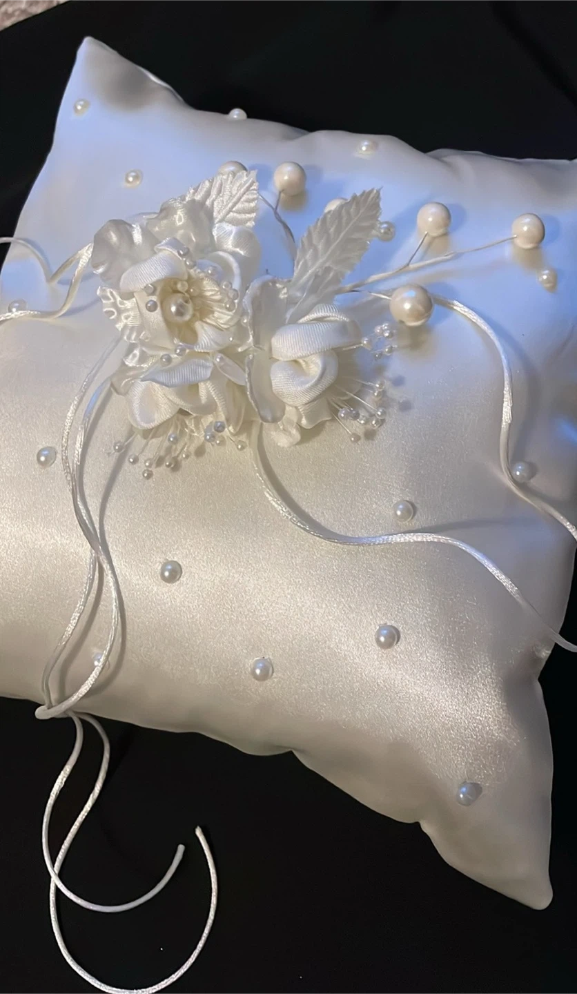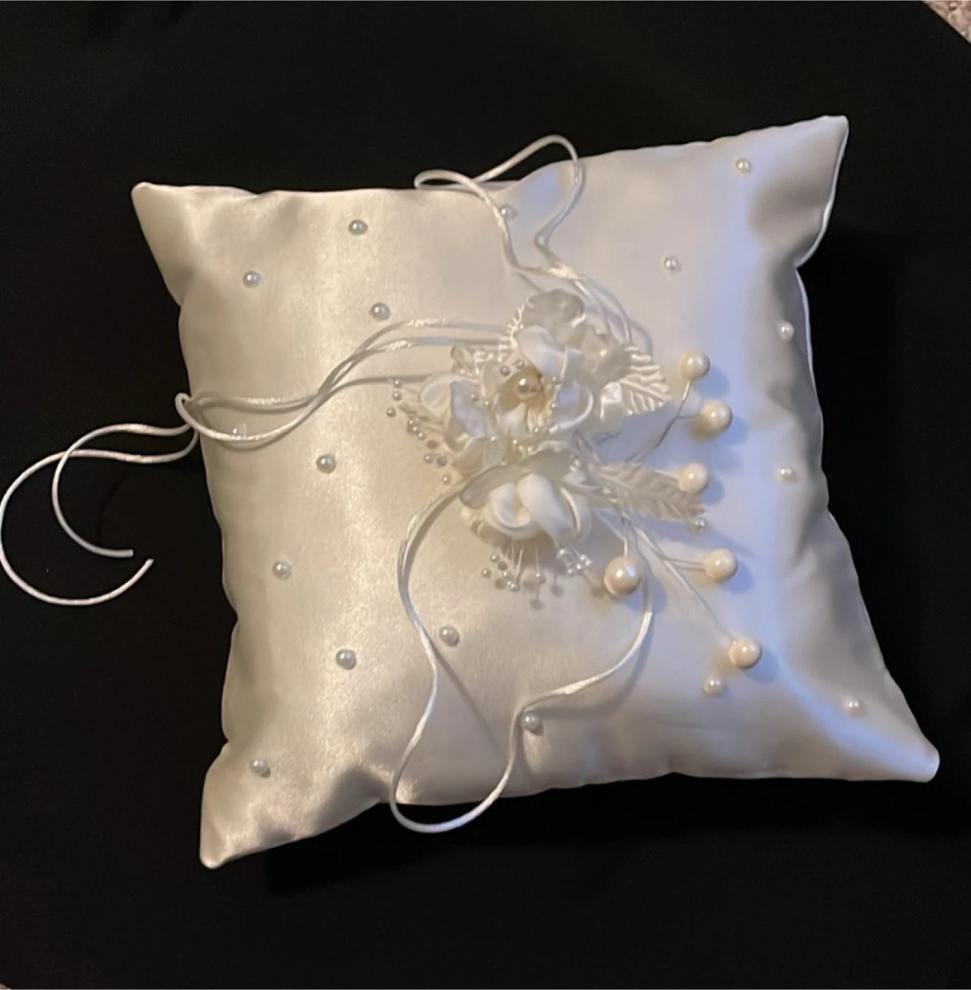 15This is a beautiful wedding ring bearer pillow. It is white with pearl and floral embellishments. Perfect for your special day!