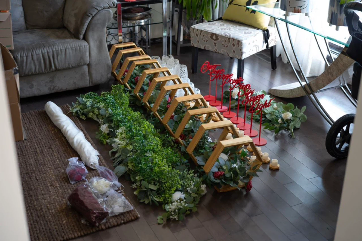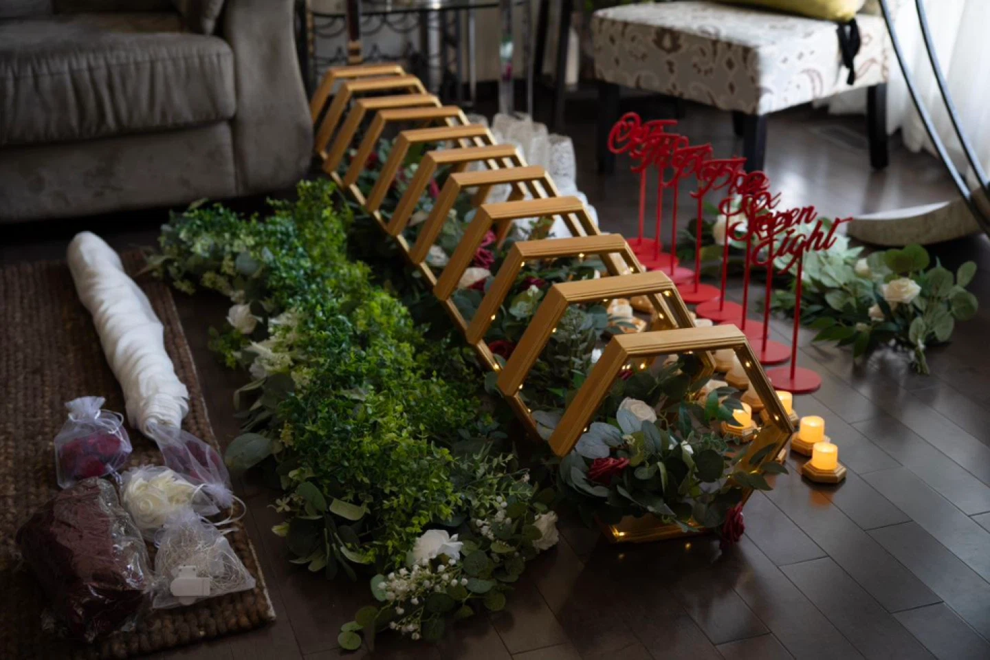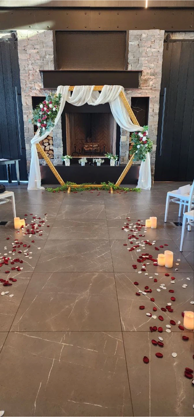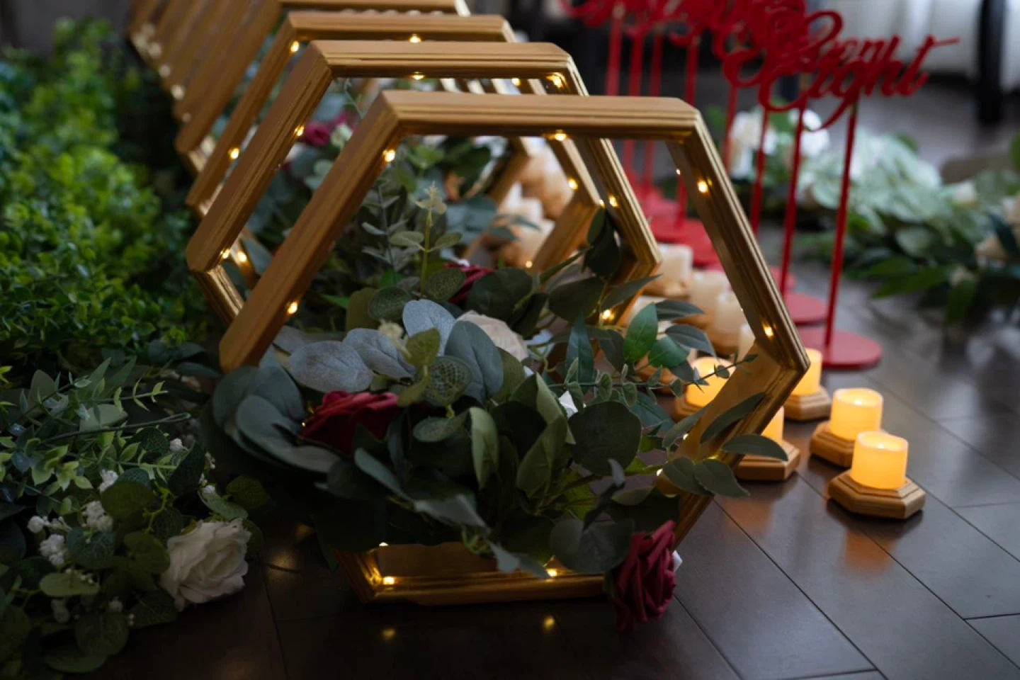 Made for a wedding with 8 tables 1 - large golden hexagon wedding arch with embedded LED lights, two faux flower bouquets, and white drape (disassembled, easy to set up on site) 10 - golden hexagon center pieces with embedded LED lights and faux flower bouquet in each (plux 1 extra golden frame with lights only) (two center pieces were used at head table) 8 - red "floating" table numbers with platforms 6 - large white candle holders / light holders / bouquet holders 6 - small candle holders / light holders / bouquet holders 12 - large golden hexagon candle holders with small LED candles 12 - small golden hexagon candle holders with small LED candles 8 - greenery strings used at head table as decoration and under arch 1 - burgundy table runner 4 - bouquets (used in large white candle holders) All packed into 7 convenient boxes I'm asking $1200 for the set, given its pristine condition, uniqueness, and completeness of the set. More photos available upon request.