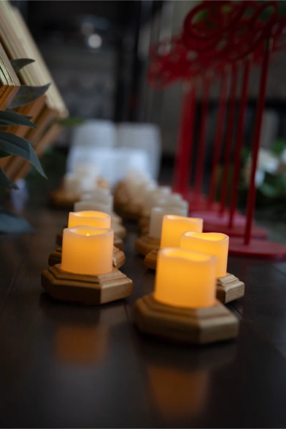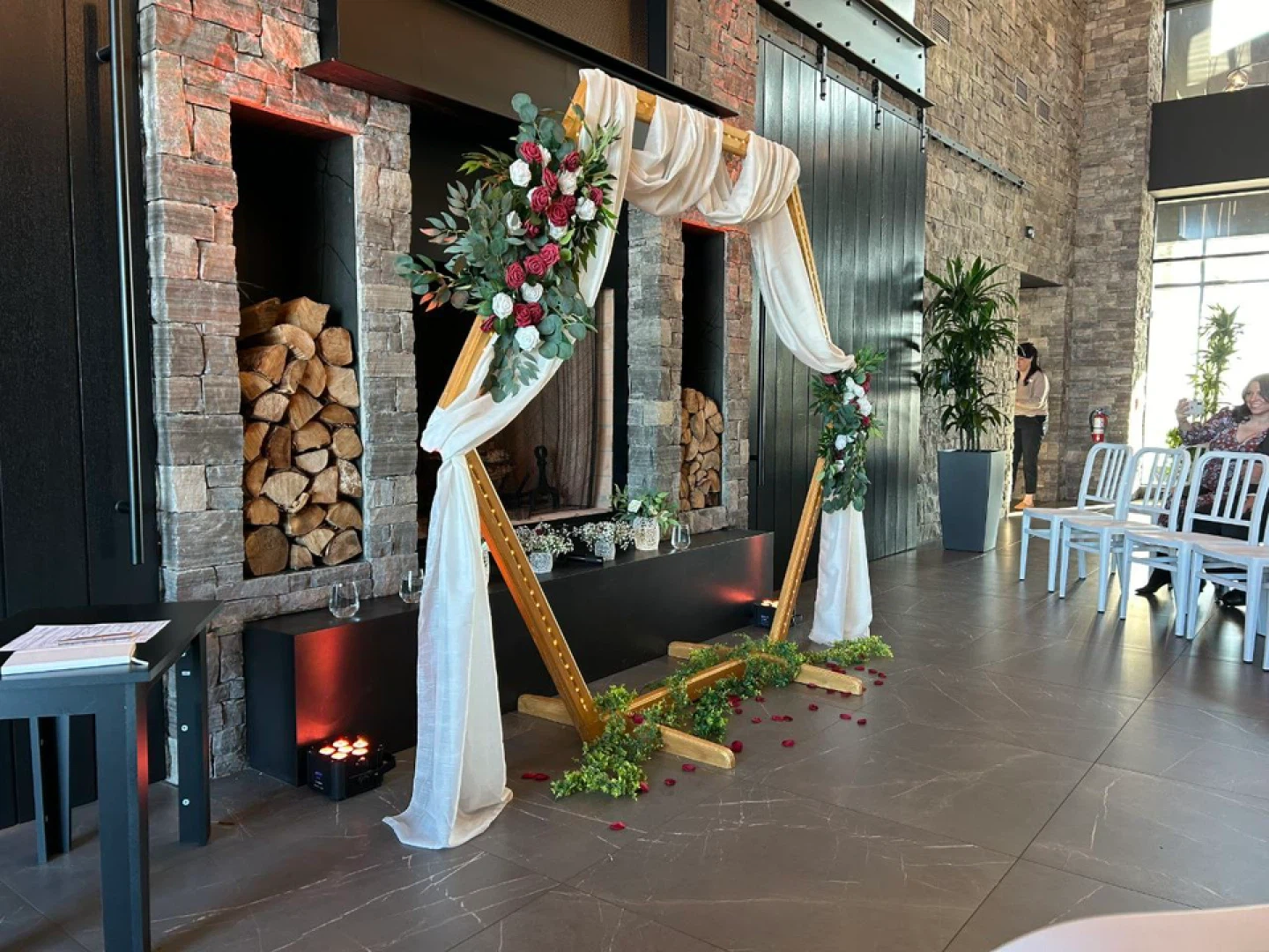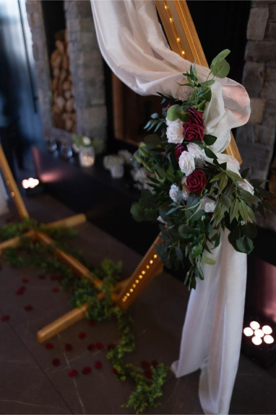 Made for a wedding with 8 tables 1 - large golden hexagon wedding arch with embedded LED lights, two faux flower bouquets, and white drape (disassembled, easy to set up on site) 10 - golden hexagon center pieces with embedded LED lights and faux flower bouquet in each (plux 1 extra golden frame with lights only) (two center pieces were used at head table) 8 - red "floating" table numbers with platforms 6 - large white candle holders / light holders / bouquet holders 6 - small candle holders / light holders / bouquet holders 12 - large golden hexagon candle holders with small LED candles 12 - small golden hexagon candle holders with small LED candles 8 - greenery strings used at head table as decoration and under arch 1 - burgundy table runner 4 - bouquets (used in large white candle holders) All packed into 7 convenient boxes I'm asking $1200 for the set, given its pristine condition, uniqueness, and completeness of the set. More photos available upon request.