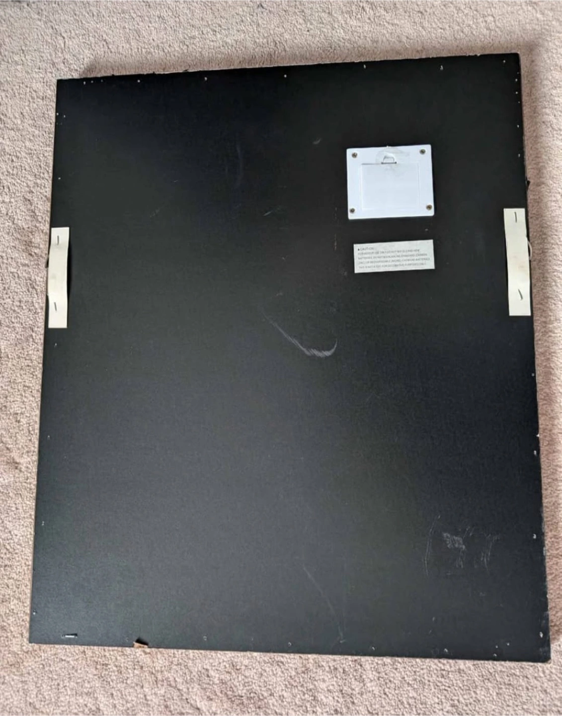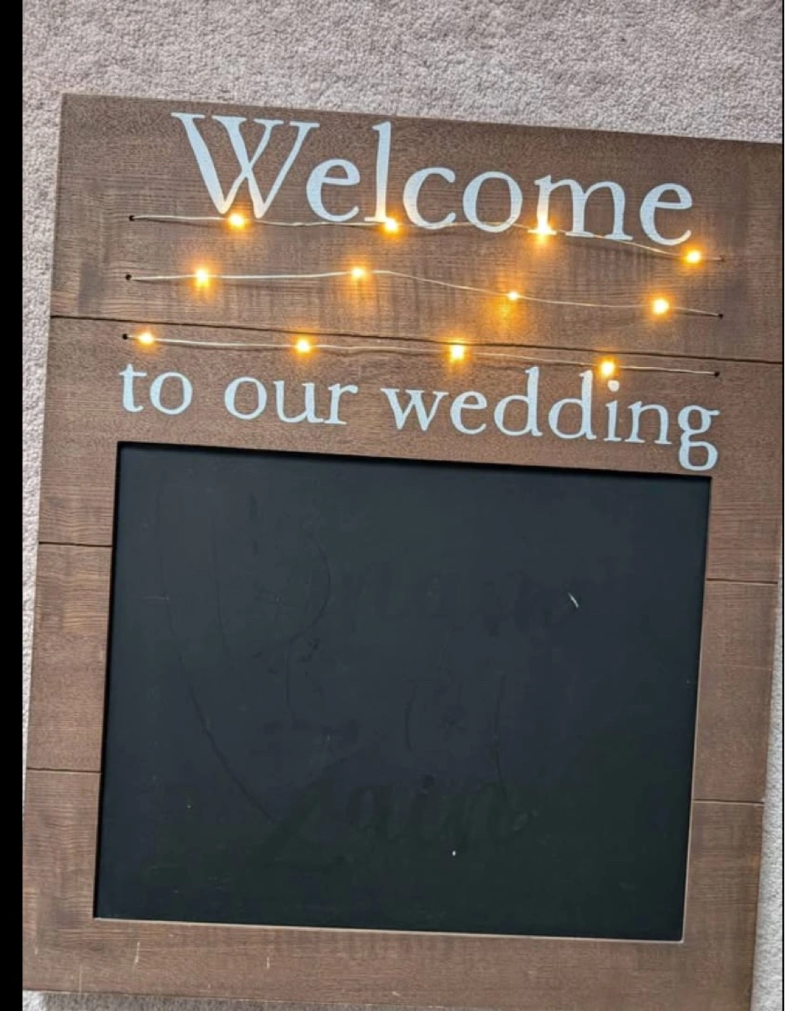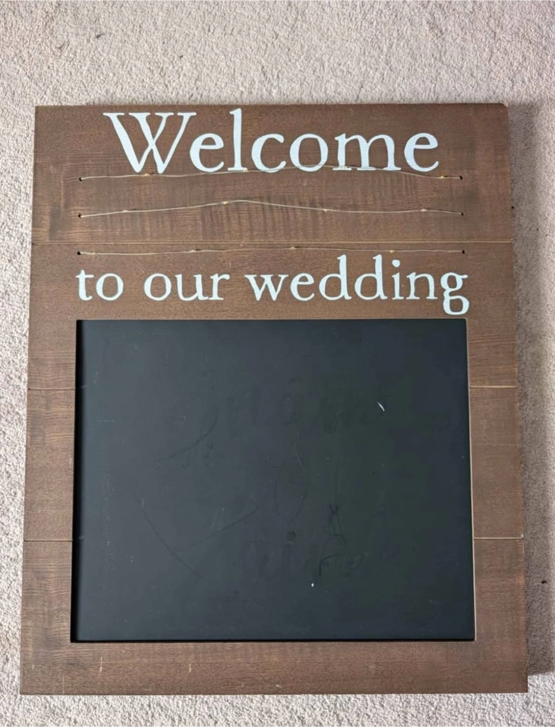 A cute welcome sign perfect for a wedding! It says "Welcome to our wedding" and has a chalkboard area for writing a special message. It also has string lights to add a little extra sparkle. It's in great condition and ready to make your special day even more memorable