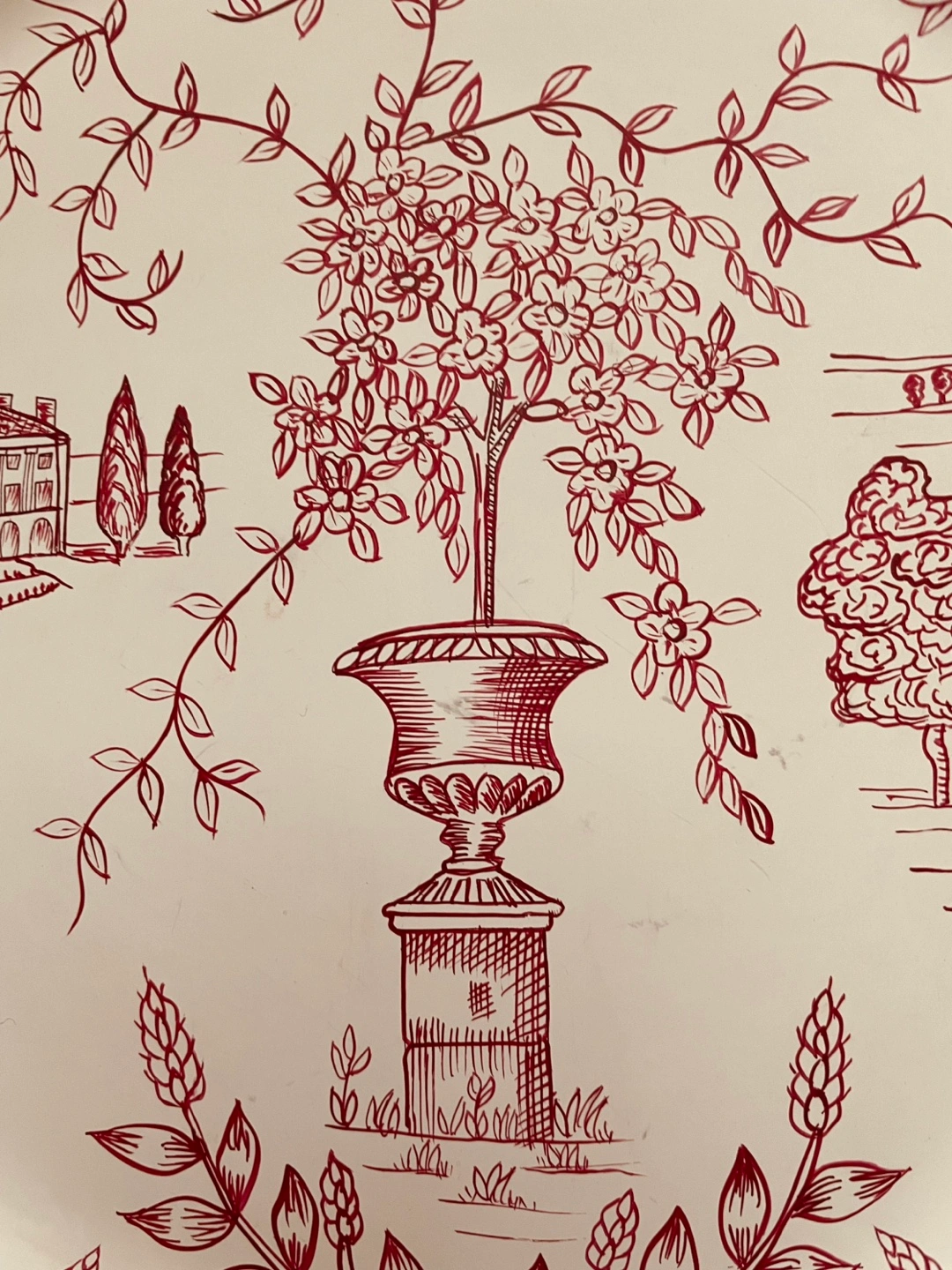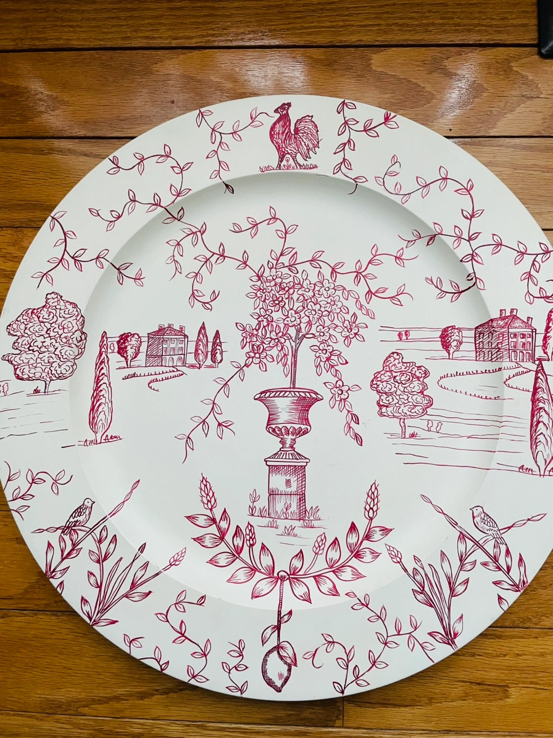 Large decorative charger plate. Hand-painted design features a garden scene in red. Not for food use. Unique and charming piece. 11“D