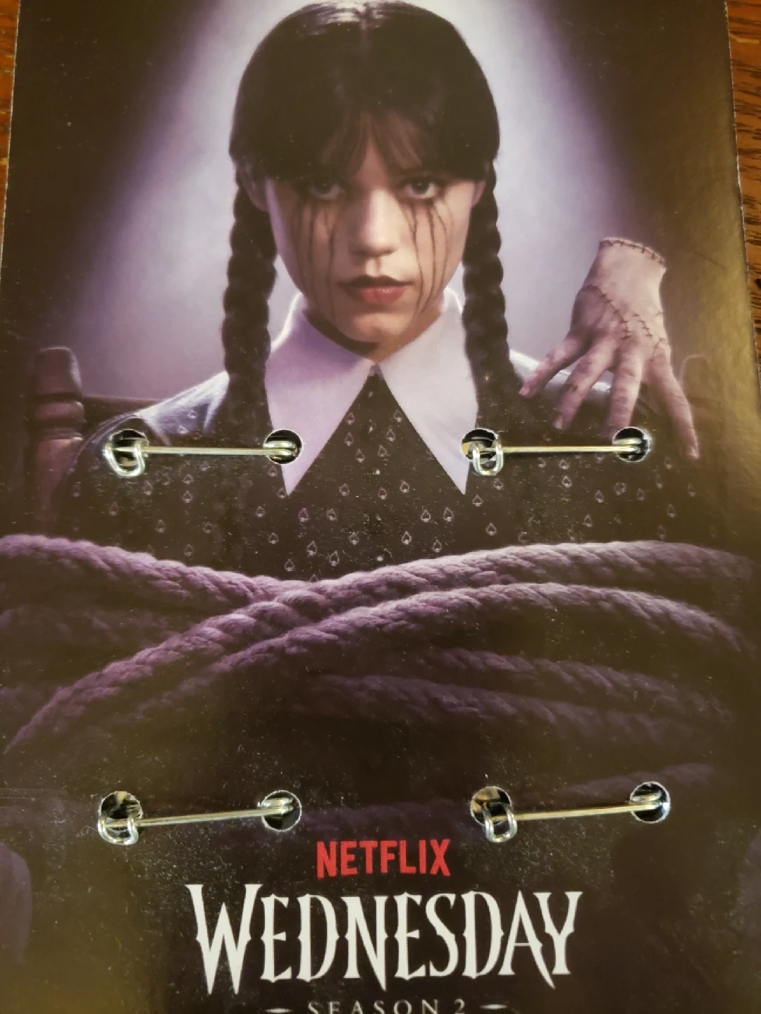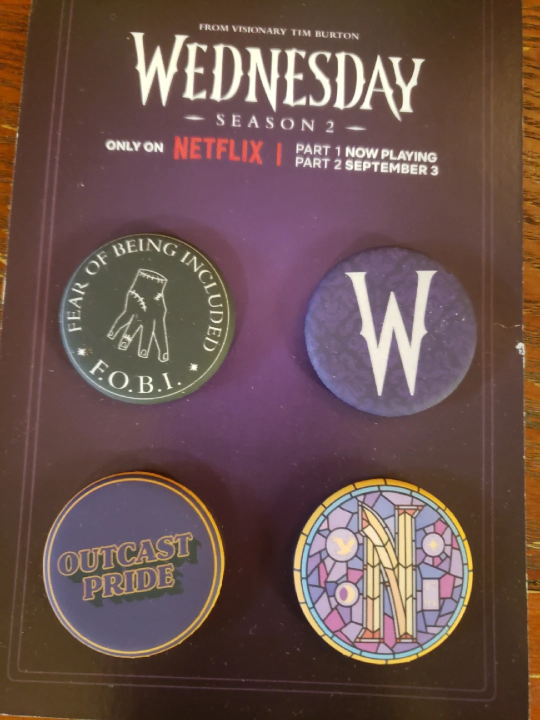 1000+Selling a set of four Wednesday Season 2 buttons from Netflix! These include a 'Fear of Being Included' button, a 'W' button, an 'Outcast Pride' button, and a stained glass window button