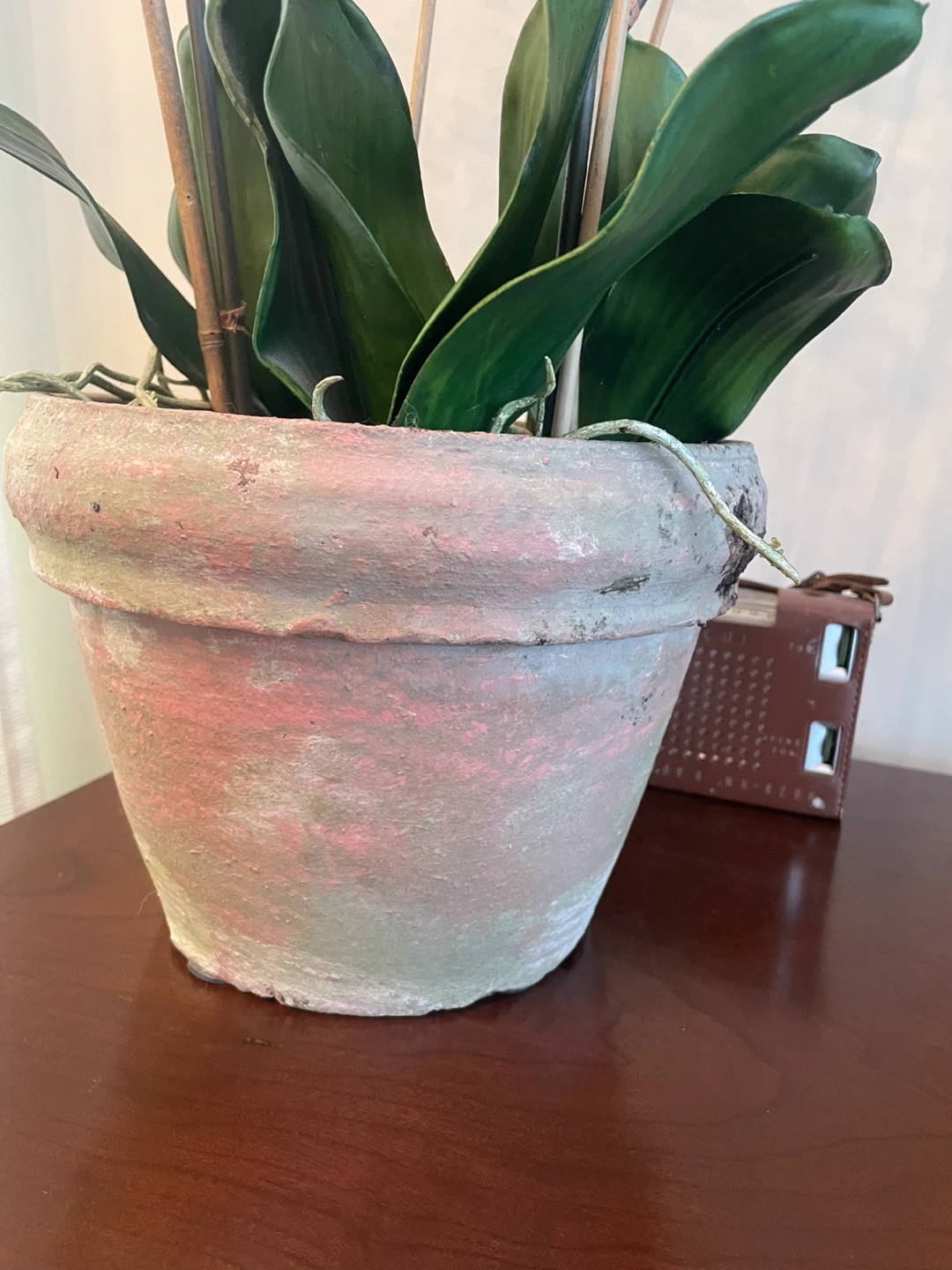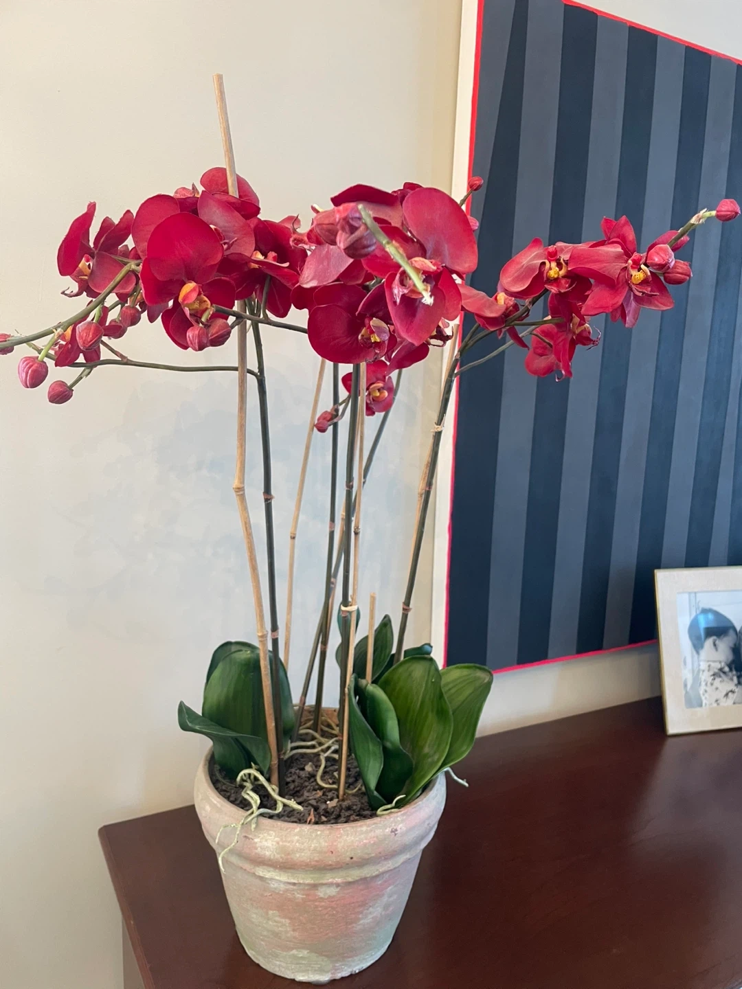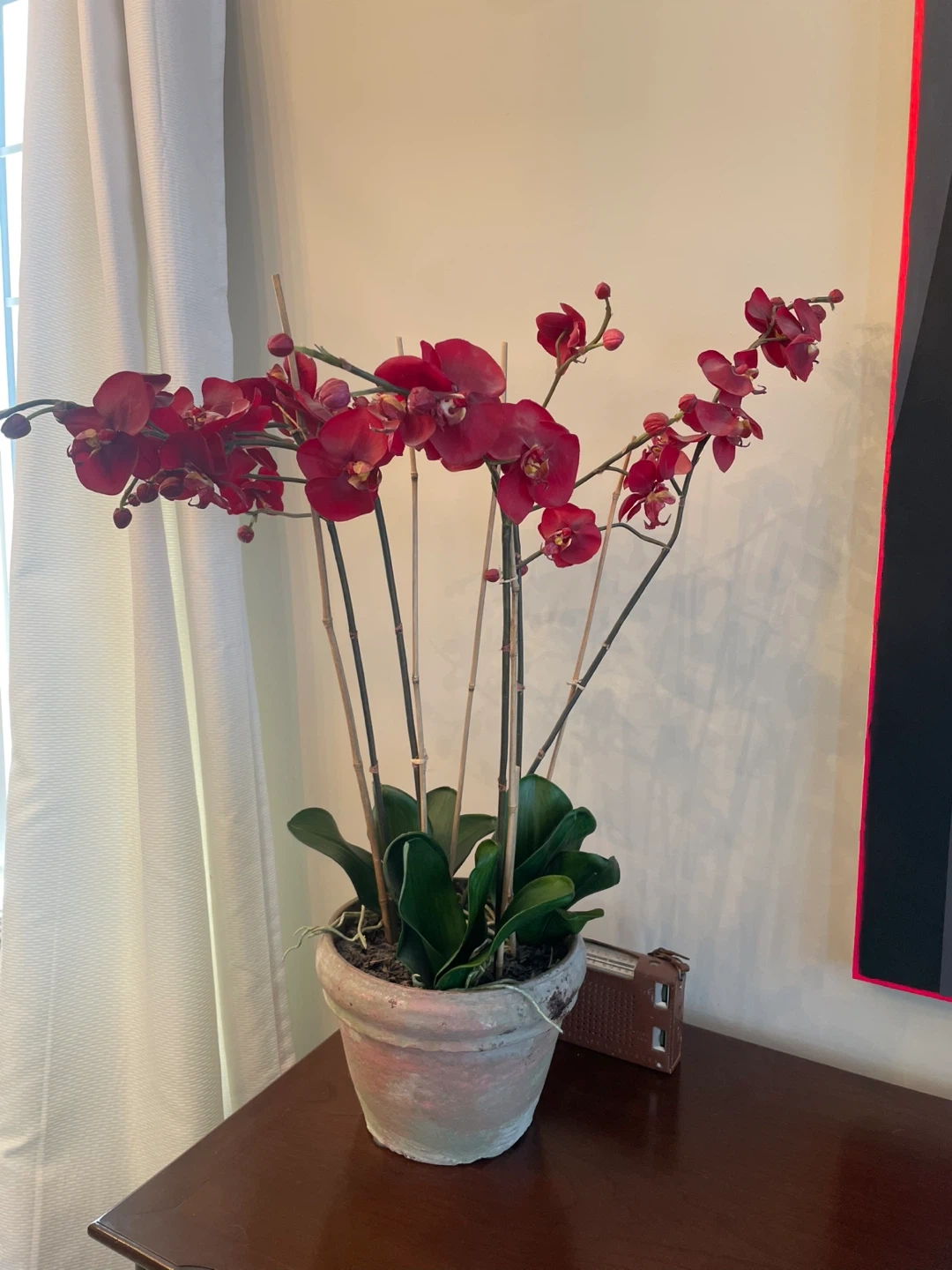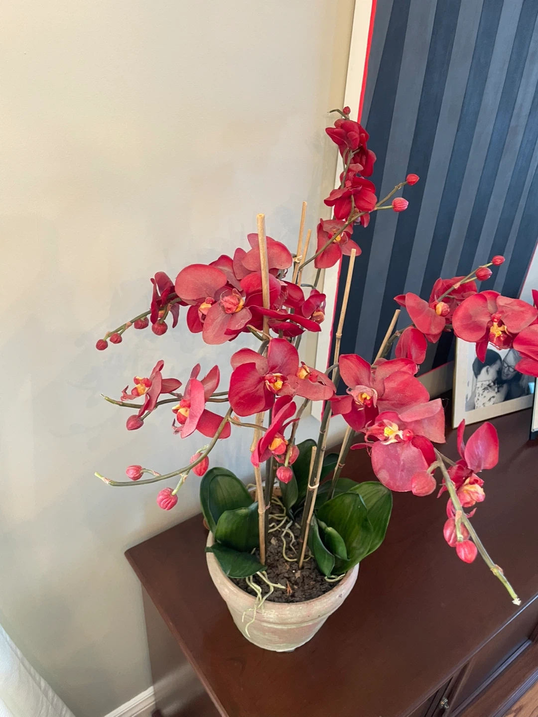 This artificial orchid plant features vibrant red blooms and realistic green leaves. It's housed in a distressed, grey and pink terra cotta-style pot with bamboo stakes for support. A lovely decorative accent for any home!