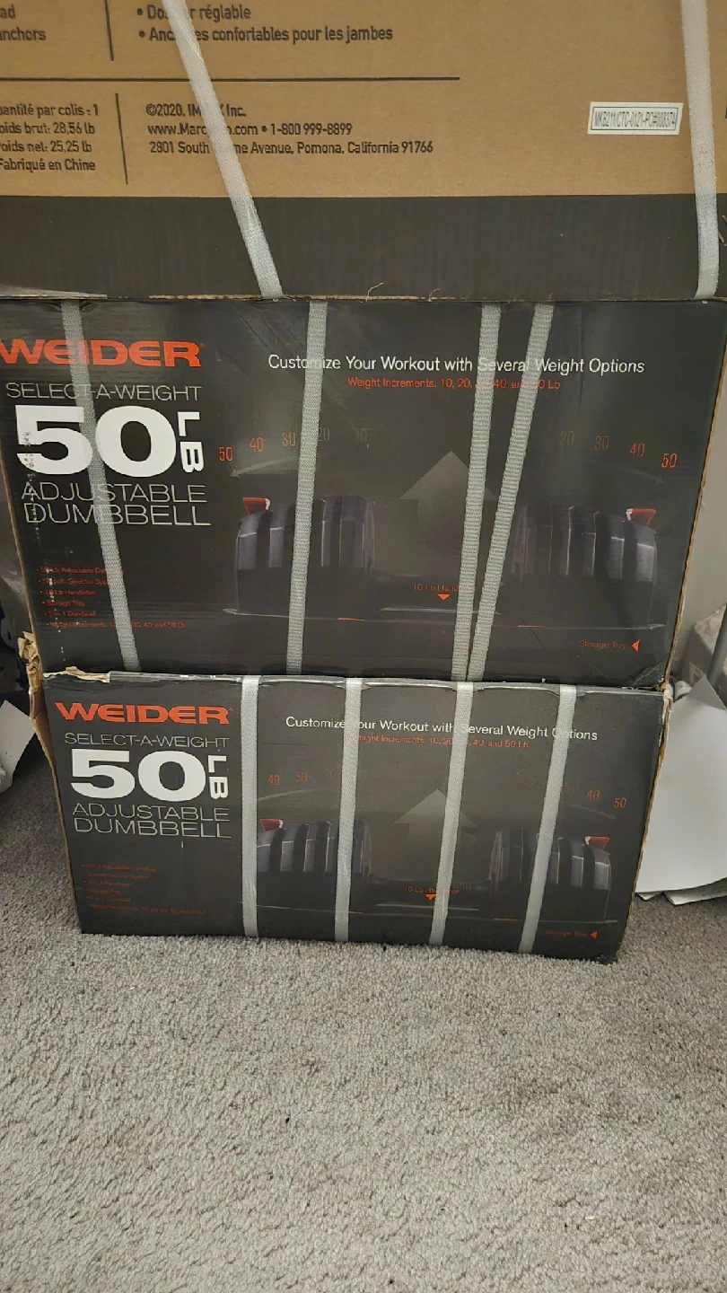 55Get ready to customize your workout with this Weider 50 lb Select-A-Weight Adjustable Dumbbell! It offers several weight options with weight increments of 10, 20, 30, 40, and 50 lb. The box is included! I have 2 sets, price shown is for 1 set. happy to make a deal for both to go.