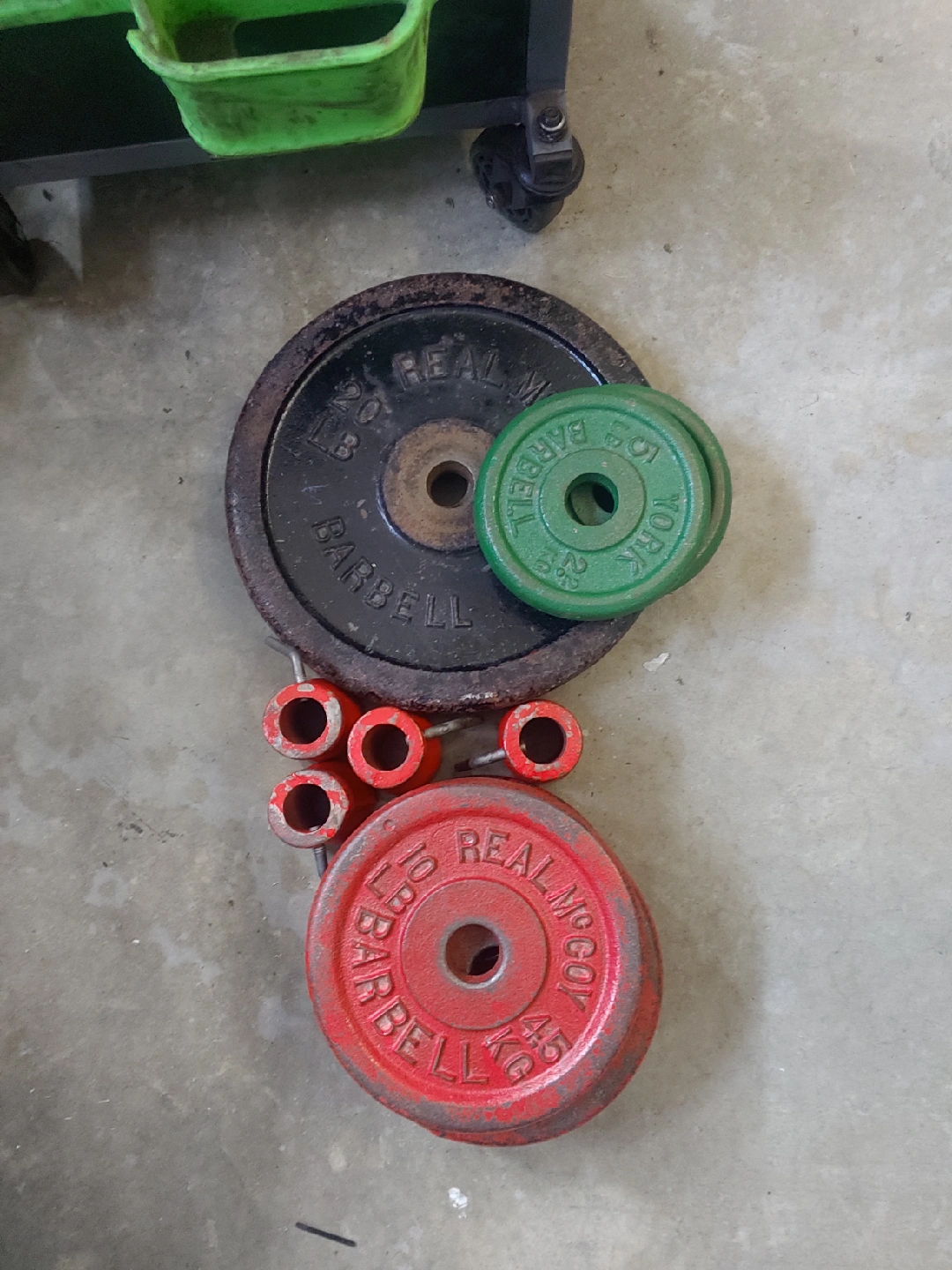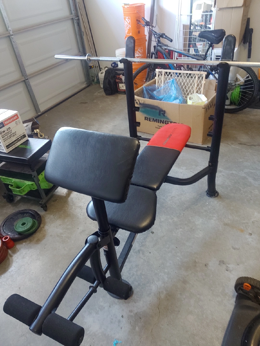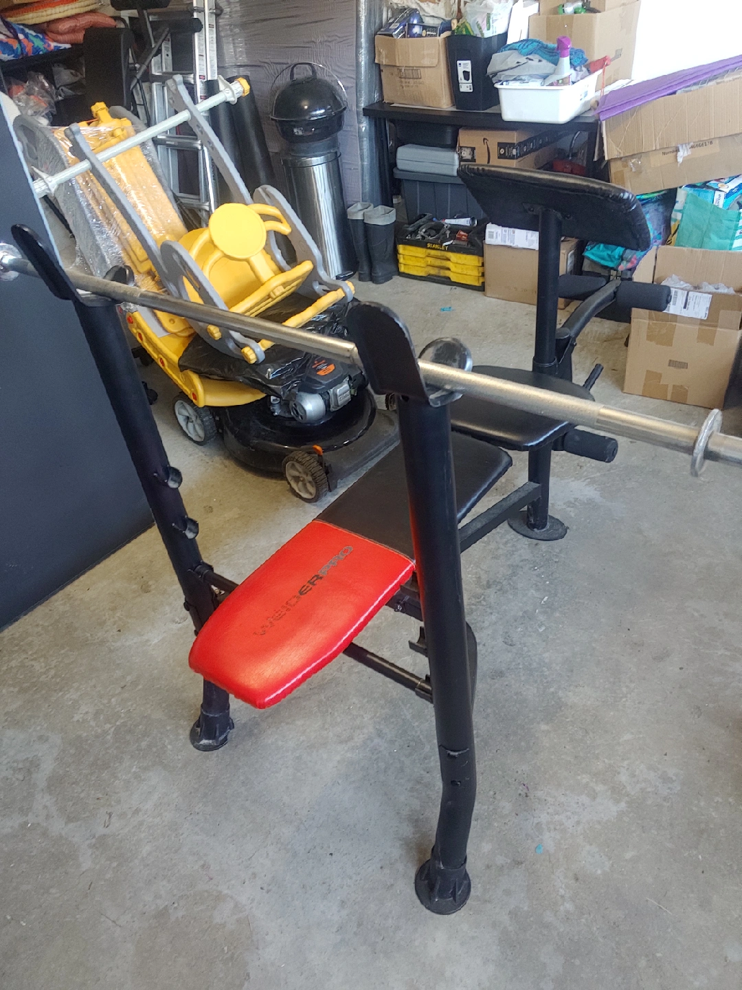 Selling a Weider Pro weight adjustable bench with barbell and weighs, perfect for your home gym setup! Includes various weights for a comprehensive workout. Get ready to build some muscle!