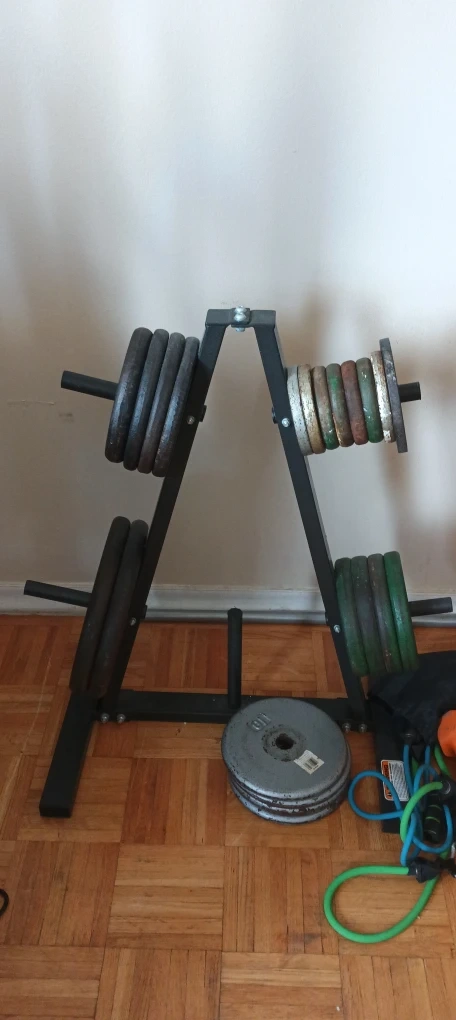24Weight plate rack with various weights. Great for organizing your home or startup gym. plates available at .50/lb