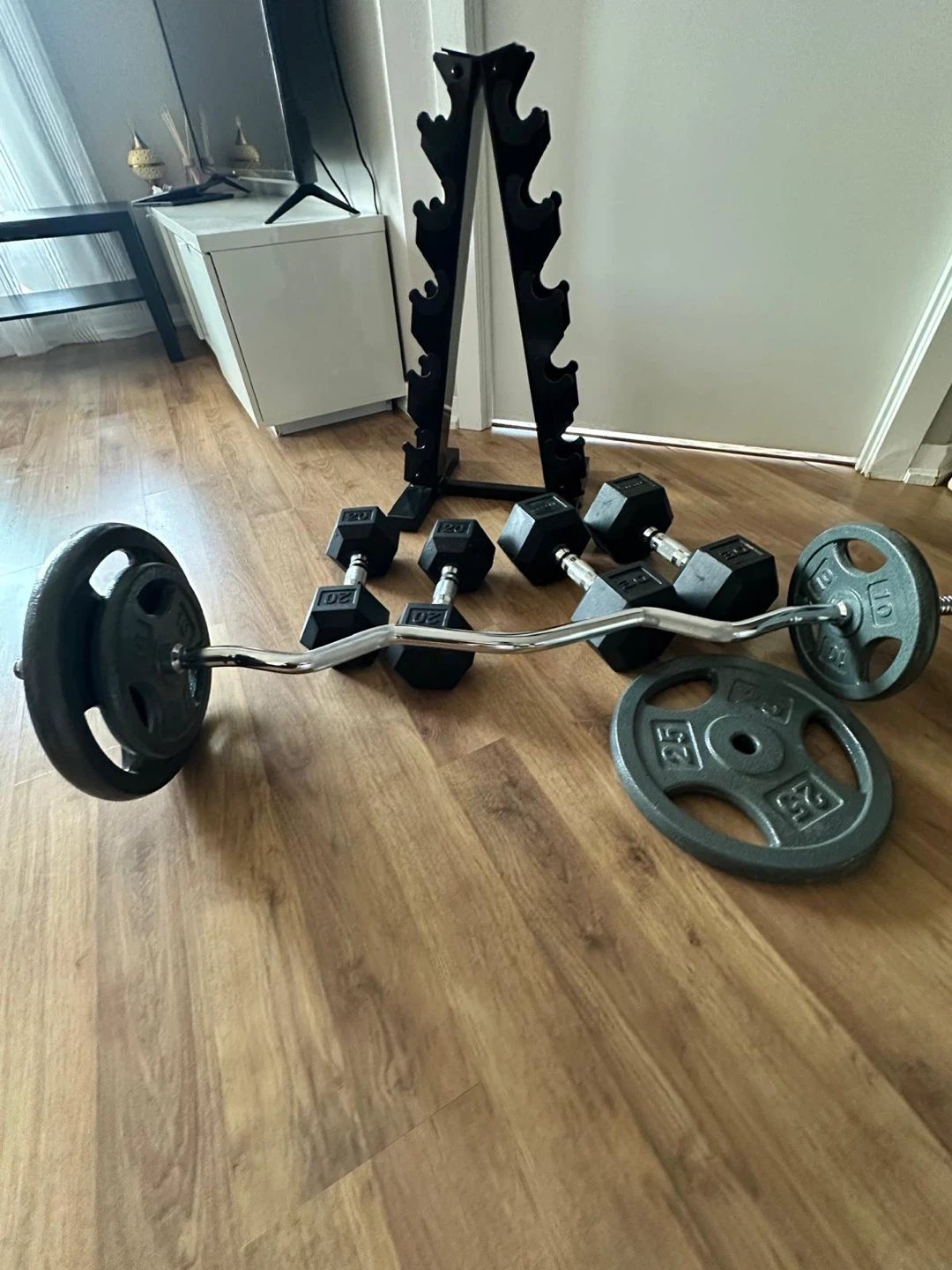 15Selling a complete weight set, perfect for your home gym! Includes a variety of dumbbells, a barbell, and a convenient rack for storage. Get everything you need for a full-body workout in one set
