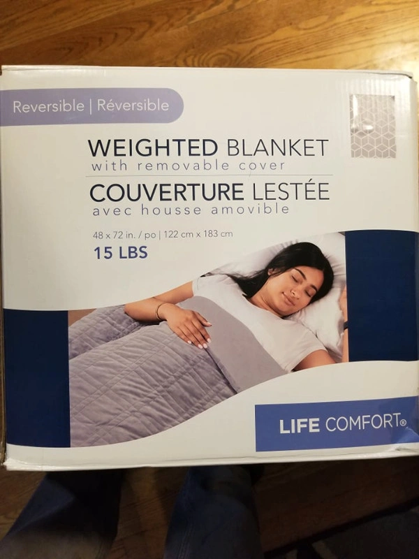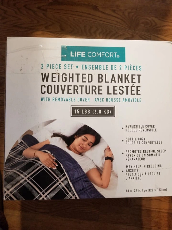 153Life Comfort 6.8 kg (15 lb) Cooling Weighted Blanket with Removable Cover Features: 1 weighted blanket 1 removable cover Enhanced cooling fabric to regulate body temperature Stimulates deep touch pressure to help promote the feeling of calm as well as a better sleep Helps ease stress and anxiety Quilted box construction to evenly distribute glass microbeads 12 integrated ties and loops to hold the blanket in place when tied to the cover Condition: New For Sale By: Owner Curbside pick up: Yes Cash accepted: Yes