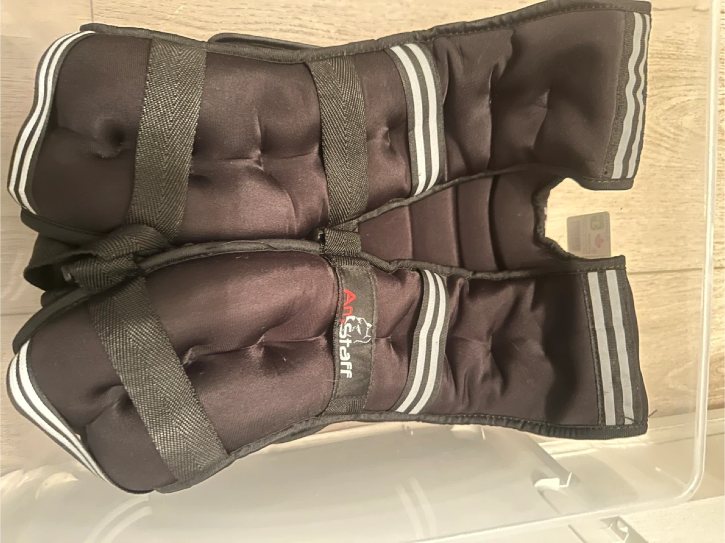 It's in great shape as only used a handful of times. A bit too heavy for me. It has adjustable straps. It's black and has reflective stripes for safety. Perfect for adding resistance to your training routine