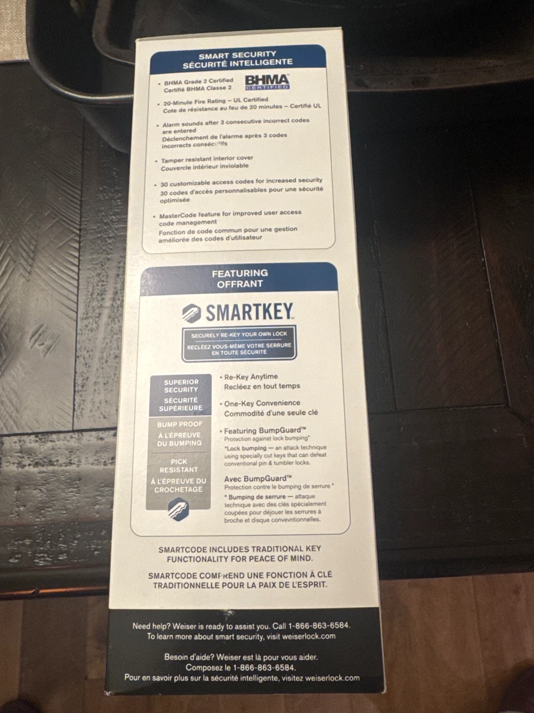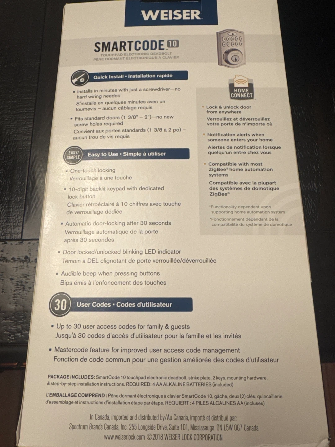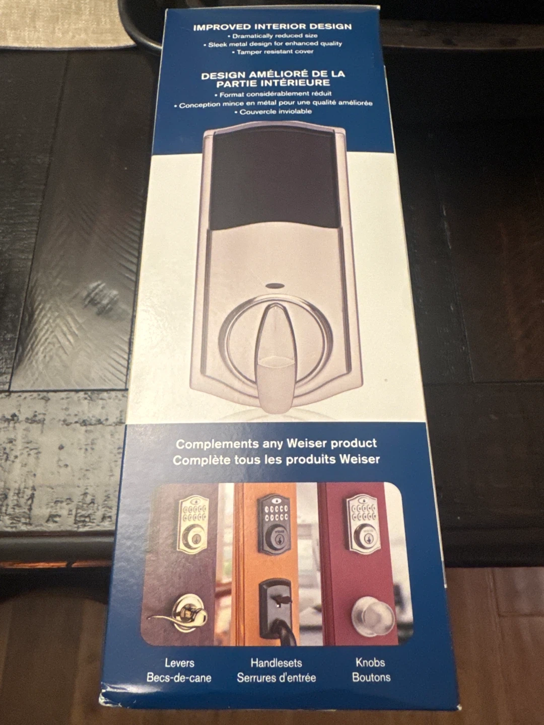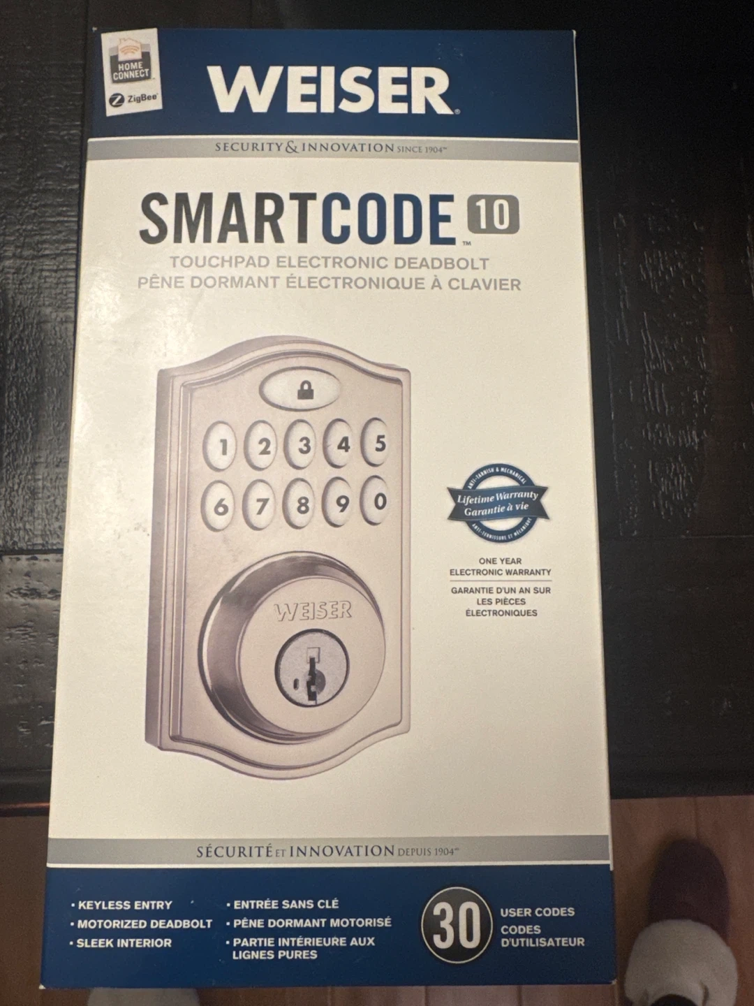 20Selling a Weiser Smartcode 10 Touchpad Electronic Deadbolt. It features keyless entry, a motorized deadbolt, and a sleek interior. It also has up to 30 user codes for family and guests. Package includes the touchpad electronic deadbolt, strike plate, 2 keys, mounting hardware, and step-by-step installation instructions. Requires 4 AA alkaline batteries. BNIB