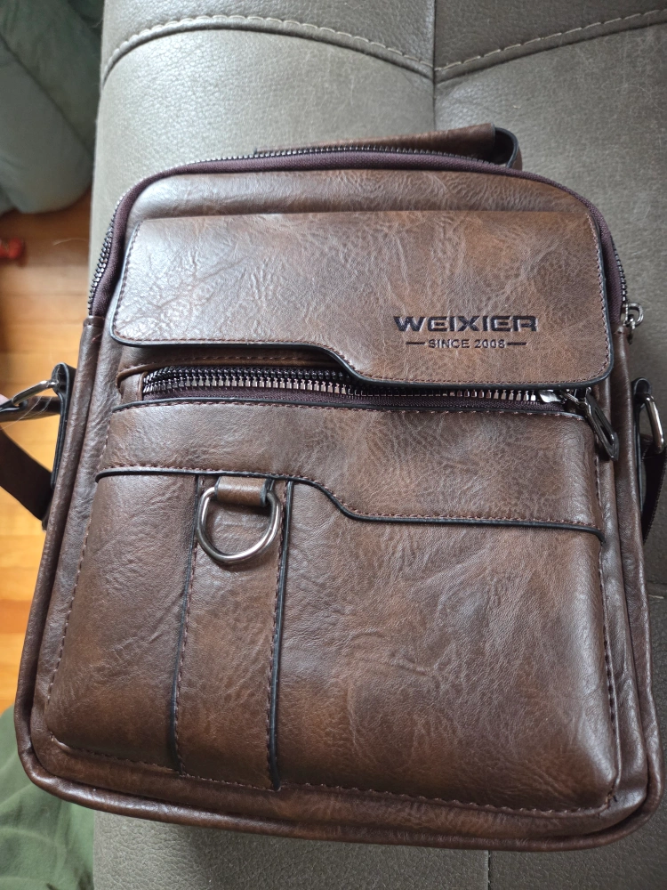 Here's a stylish Weixier messenger bag in a lovely brown leather. It's got a few handy zippered compartments and a nice adjustable shoulder strap. Perfect for carrying your essentials around town!