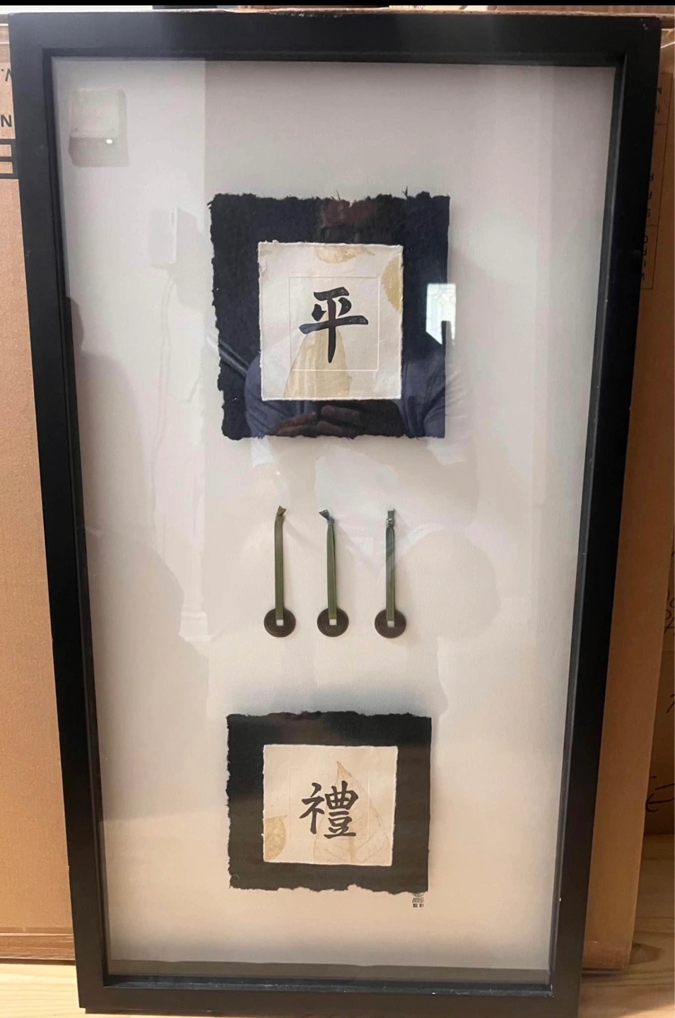 This framed wall art features a "West Coast" exclusive design, made in Canada. It showcases two square art pieces with Asian calligraphy symbols and three decorative dark circular elements suspended between them. It's a unique decorative piece for your home.