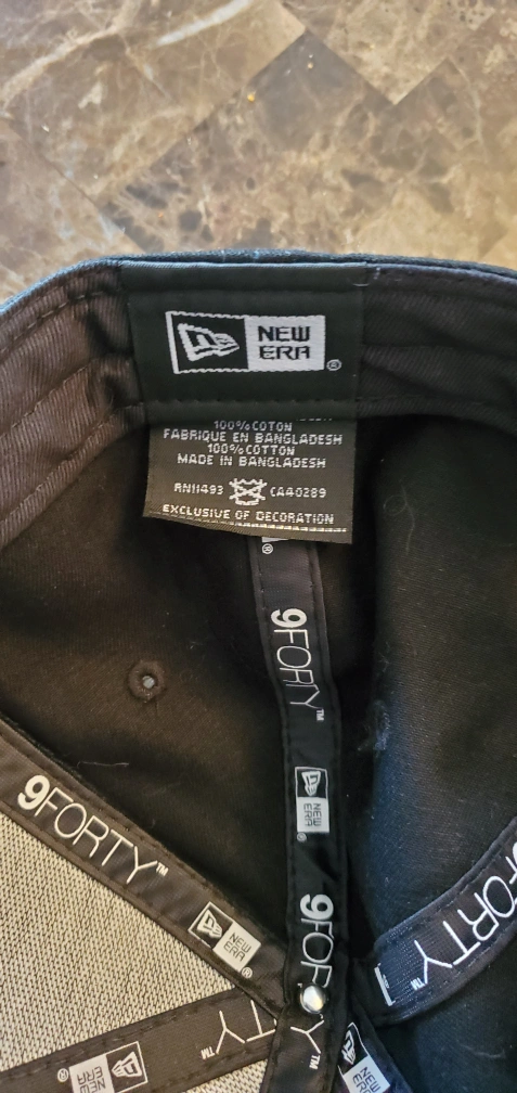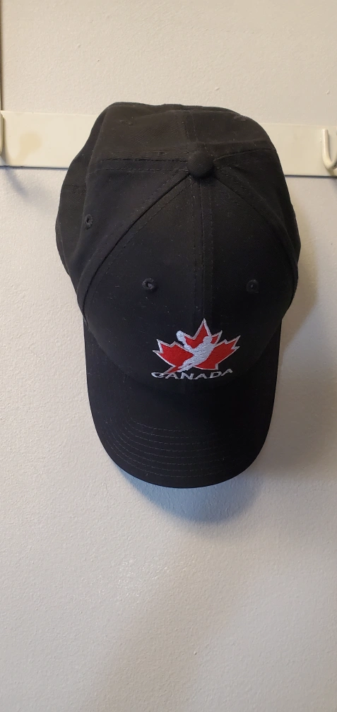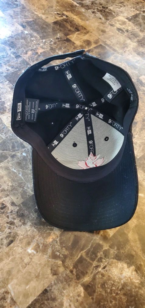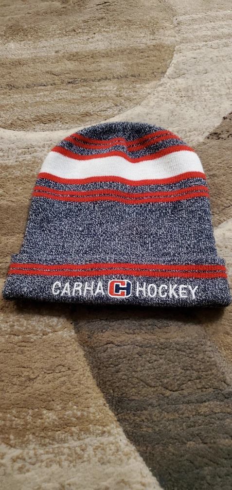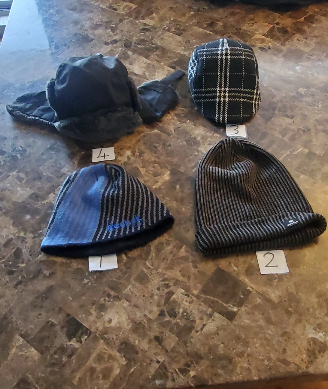 Set of 4 hats. One black and blue knit hat with grey stripes. One grey knit hat with black stripes. One black and white plaid hat. One grey fur lined hat.