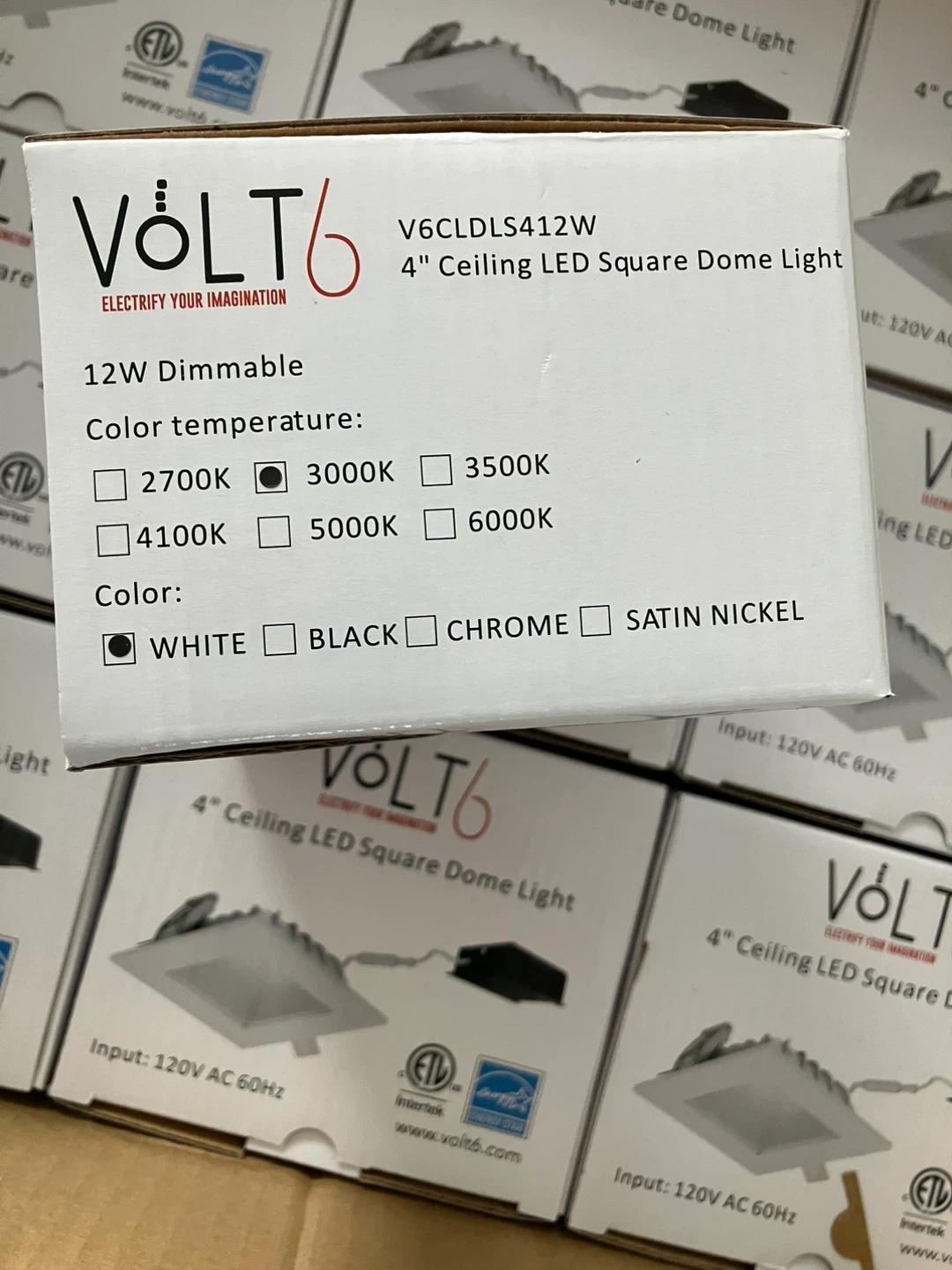 This is a 12W dimmable VOLT6 LED dome light. It's a 4-inch square ceiling light. Input is 120V AC 60Hz. Available in White, Black, Chrome, or Satin Nickel finishes and multiple color temperatures.10 pieces.
