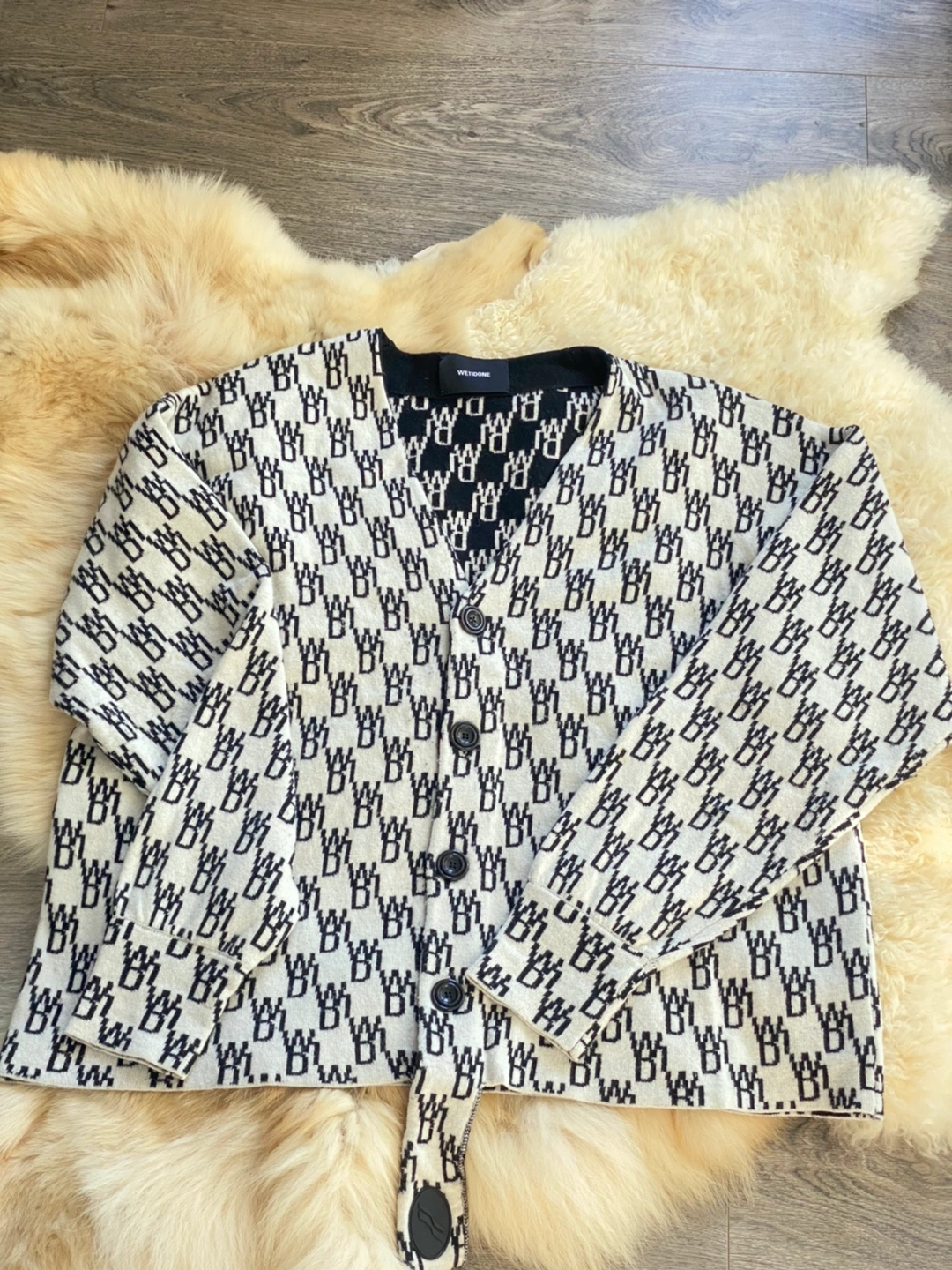 18Beige and black monogram cardigan with button closure. Original price $368. Trendy cardigan.