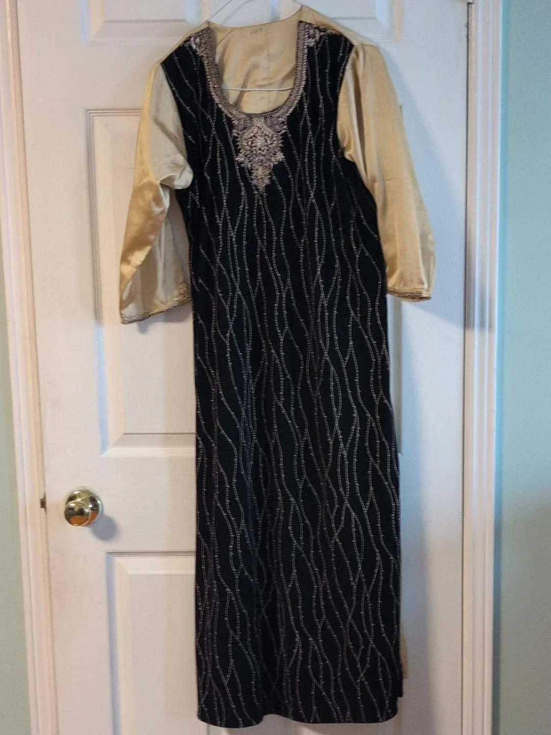 This is a black maxi dress with a gold satin top and sleeves. It features intricate silver thread detailing on the bodice and skirt. The neckline is also embellished with silver beadwork. It's perfect for special occasions.