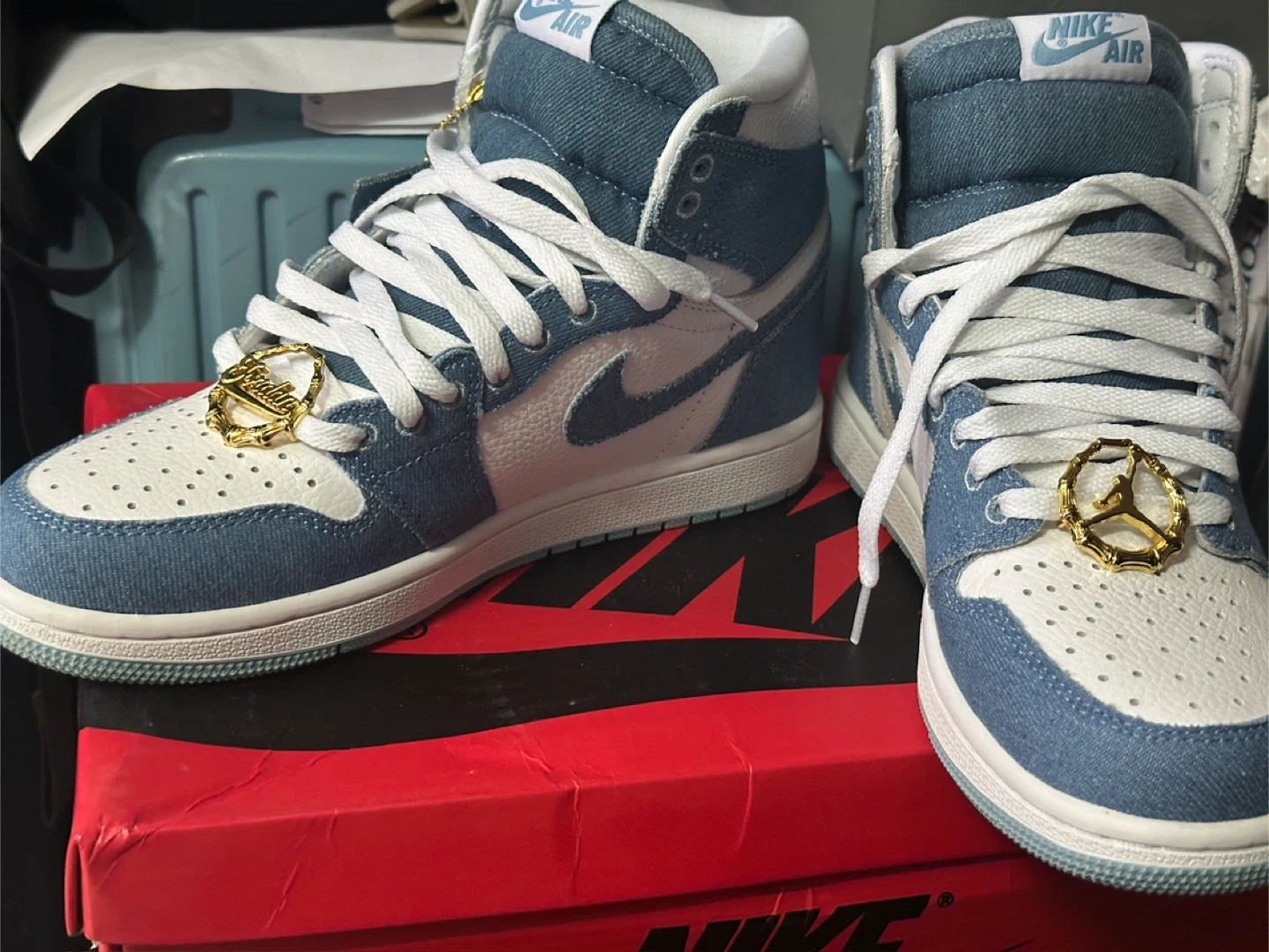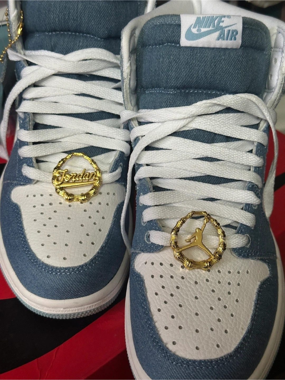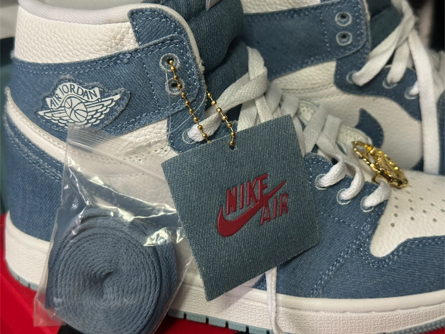 These Air Jordan 1 High OG sneakers feature a denim and white colorway. They include original laces and Jordan-themed lace locks. Comes in its original box.