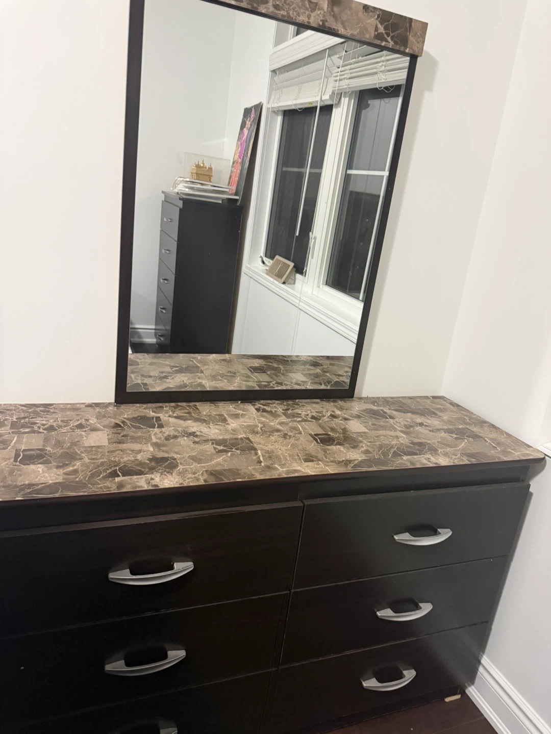 Dark brown dresser with a marble-look top. It has six drawers for storage. Includes a matching mirror. Great for organizing clothes and accessories!