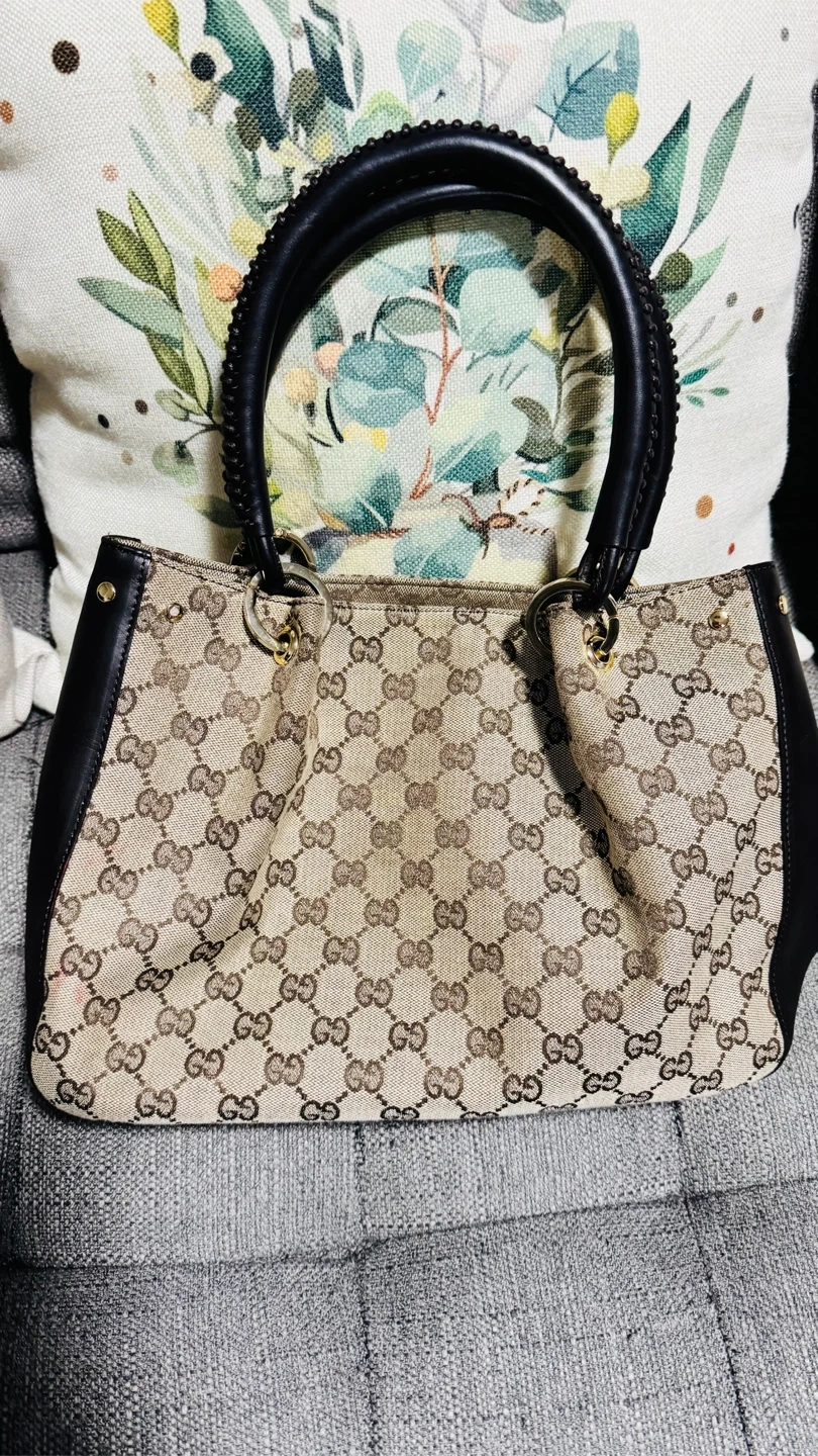 This Gucci tote bag features the iconic GG monogram canvas with black leather trim and handles. It has a spacious interior lined with black fabric. Gold-tone hardware is present throughout. This bag is great for everyday use, carrying your essentials in style.